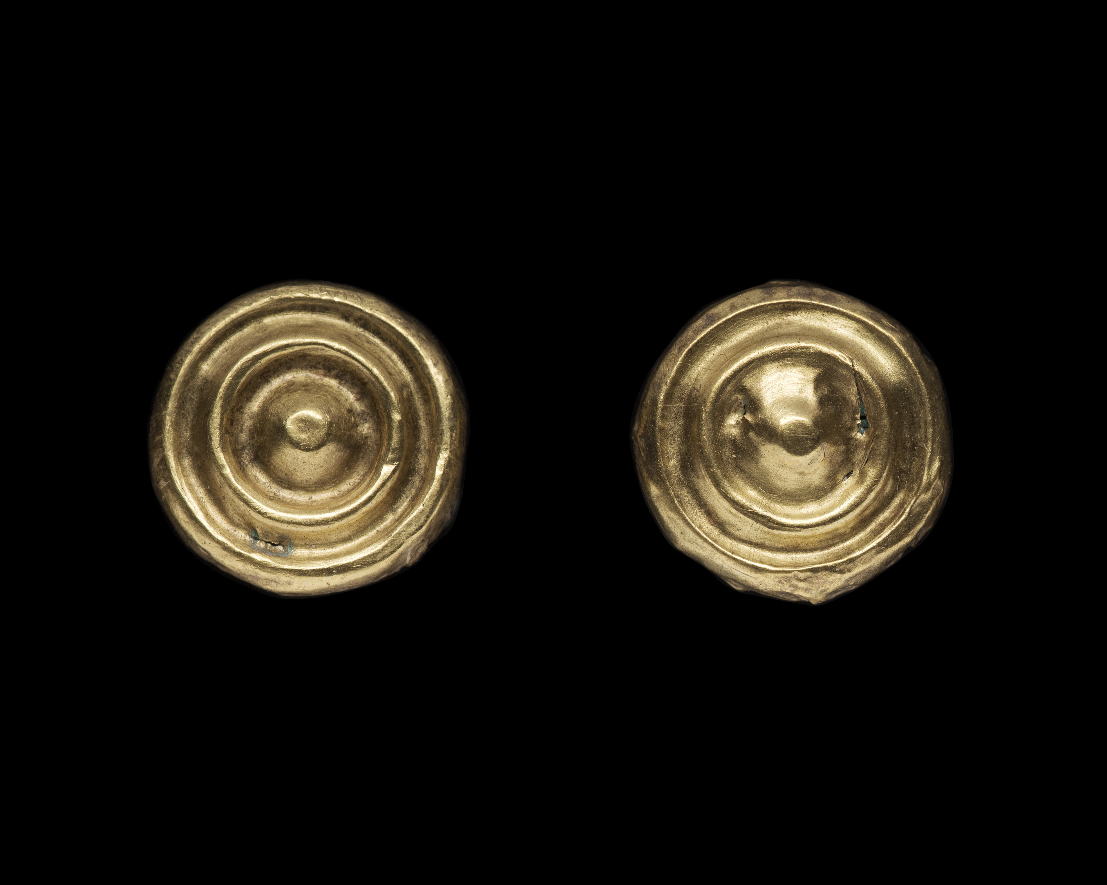 Dubbelknapp med tunt guldbleck på ovansidan. M per IV. Funnen i ekkista i hög.