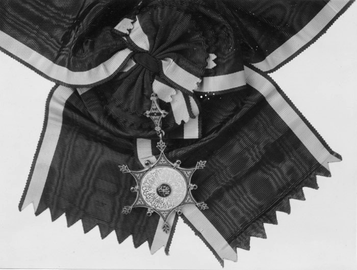 Axelband av smaragdgrön sidenmoaré med 9 mm breda vita ränder, 2 mm från kanterna. Tandade bandändar, ca 150 mm därovanför sammanbundet och däröver en rosett, på baksidan fastsytt en karbinhake av gulmetall.
