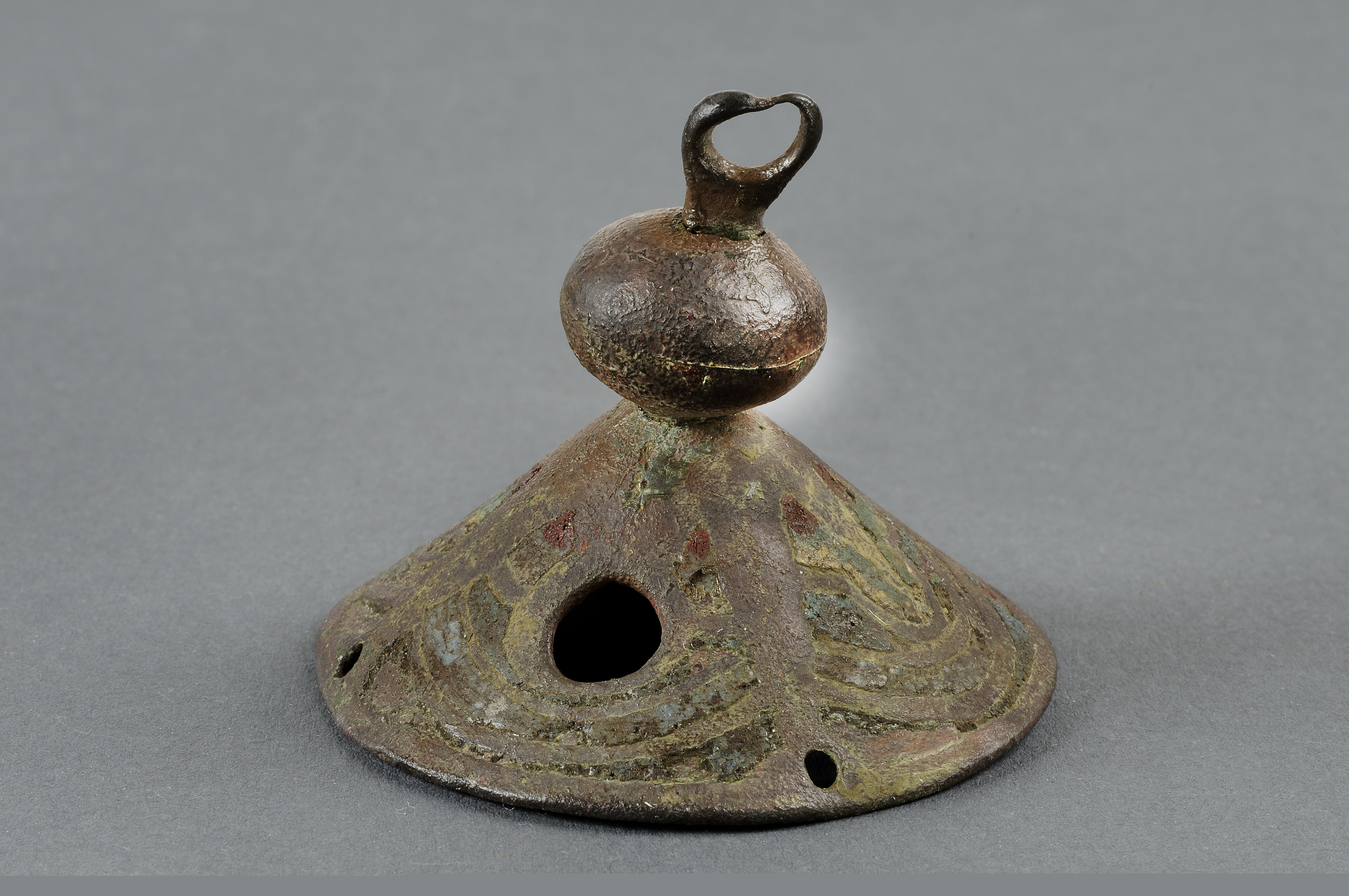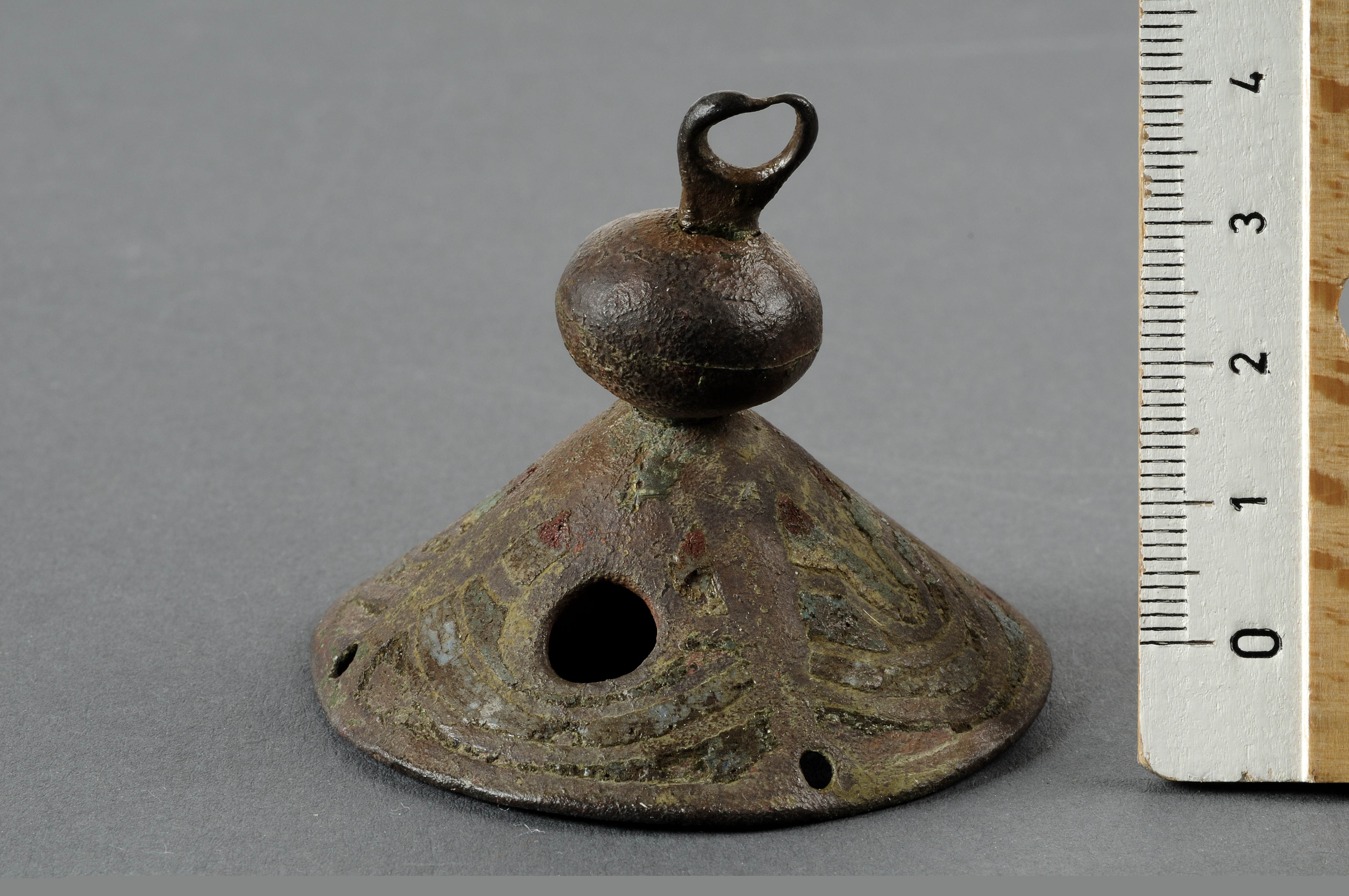 Lock till ett rökelsekar. Locket har formen av en kon, krönt med en kula med en bärögla på toppen. På konen finns ornering i form av en stjärna och palmetter ett stiliserat palmblad utförda i emalj. Emaljen är kraftigt skadad, kanske av eld.
