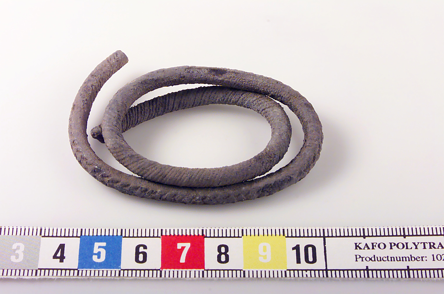 Rundad ten, rullad i två varv. Spiralornerad samt stämpelornerad. Skadat ytskikt.