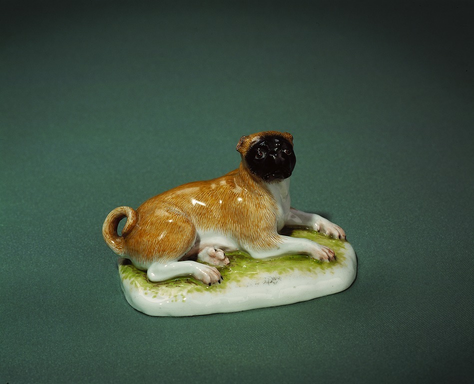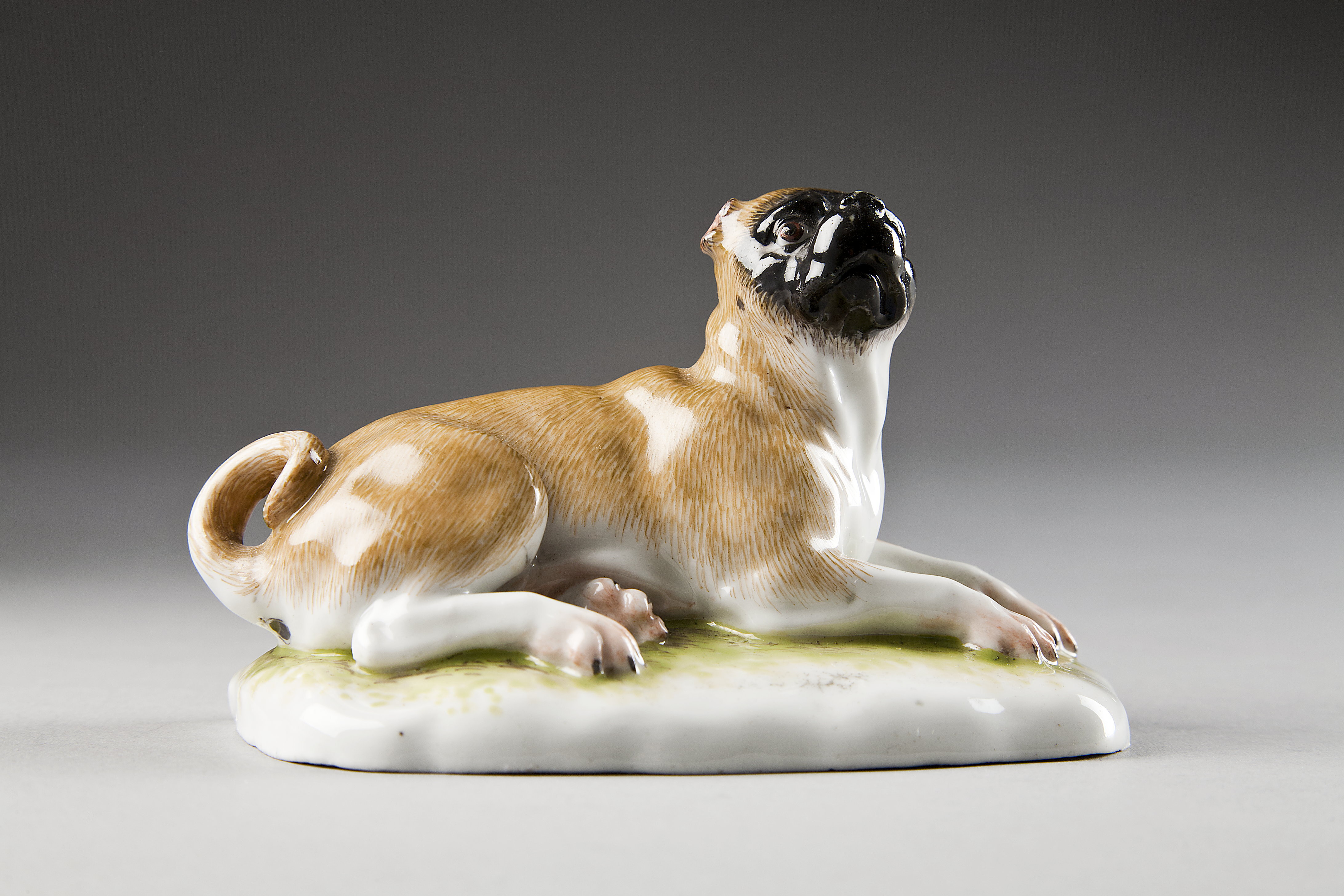 FIGURIN. Liggande hund på avlång fotplatta. Huvudets framparti är svart, pälsen i övrigt ljusbrun. Kopia av Frankenthal modell med imiterad Frankenthal märkning Pris: 27 Mk. Se Rescontra WvH 31 juli 1891 samt toilettbok