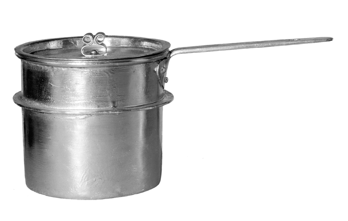 SÅSKASTRULLER med lock, sex stycken Av förtent kopparplåt. Nästan cylindriska, med svagt skålig botten samt med fläns och något snett utstående skaft; kring brädden en utstående grov stav; flänsen smal, rakt utstående samt anbragt ett stycke ovanför mitten. Skaft av järn, platt, avtunnat utåt samt fäst med en från skaftet utsmidd nedböjd hjärtformig flik, vari tre nitar. Höjd: 12-12,9 cm.; diameter: omkring 14,3 cm. Skaft, längd: 14,5 cm. Lock: Låga, svagt kupiga, kring kanten en rakt uppstående fals med rakt utstående kantfläns; i mitten ett handtag av platt skena med ändarna S-formigt uppsvängda och stödda mot varandra; handtaget fäst med en nit. Höjd: omkring 1,2 cm.; diameter: omkring 14 cm. Svensk tillverkning, Stockholm; J. & C. G. Bolinders Mekaniska Verkstads AB.