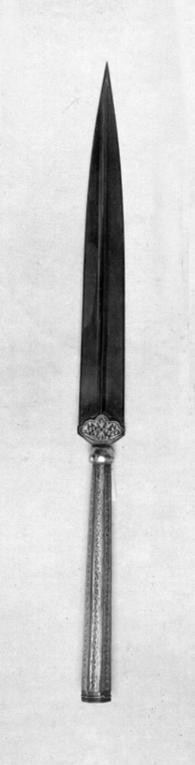 Tvåeggat damaskerat blad med jämnbreda mötande skär. Fäst vid holken genom en oval stålplatta med vågig främre kant med påslagen dekor i form av guldslingor. Holk av brunerat stål, 185 mm lång, 7-kantig med påslagen dekor av guld i form av oregelbundna slingor. Holkens nedre del är odekorerad, medan den övre är kulformad och förgylld.