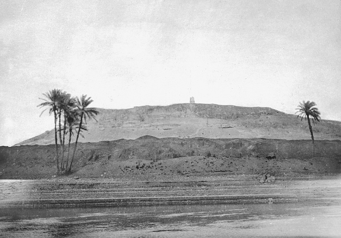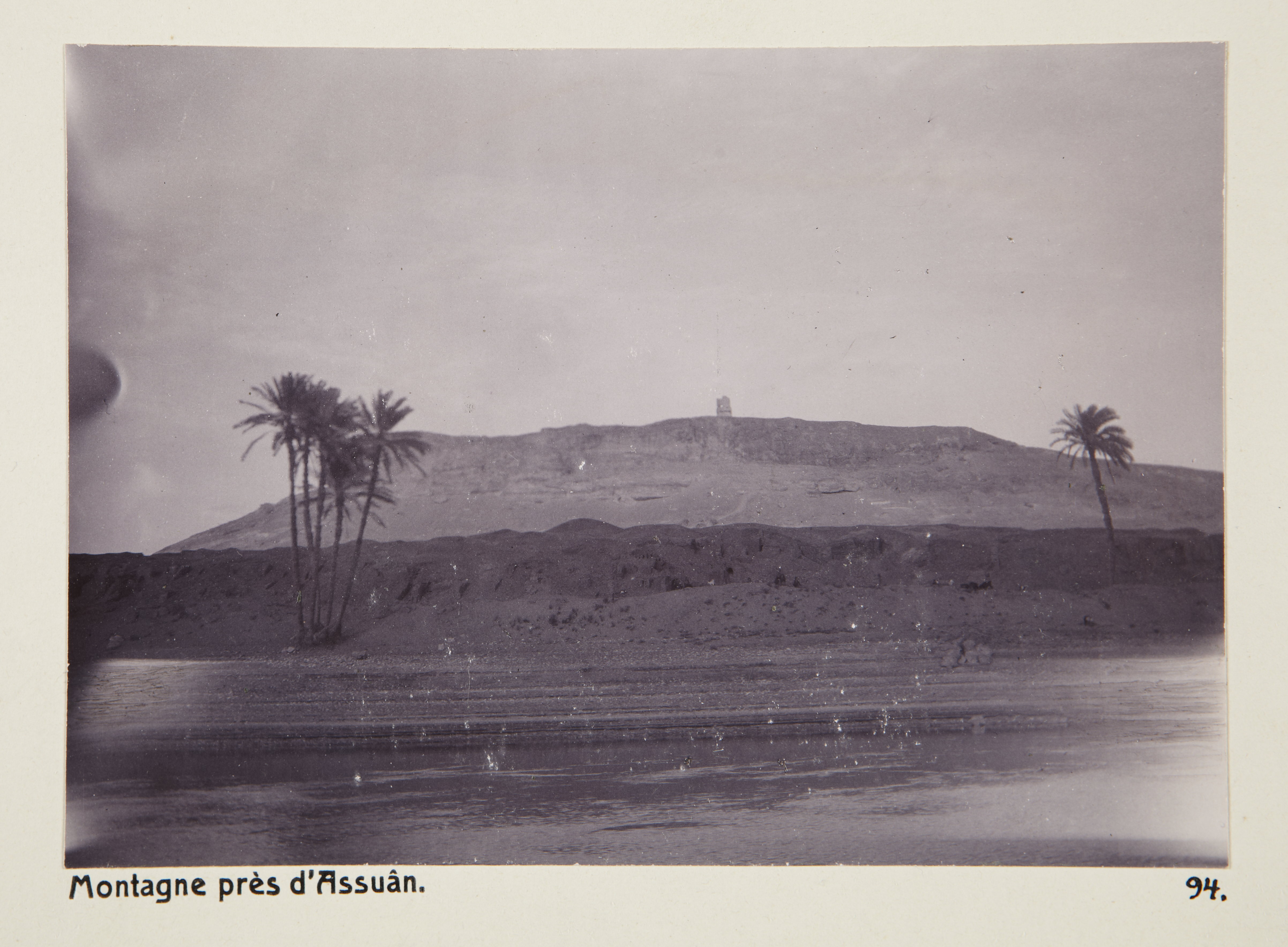 Berg nära Assuan. Egypten. Text på fotografiet: Montagne près d`Assuân. Fotografierna LXVI:M.01.- 201. kommer från resan till Egypten och Sudan som Wilhelmina och Walther von Hallwyl gjorde vintern 1900-1901. De lämnade Sverige den 5 november 1900 och fortsatte från Egypten till Palestina den 28 mars 1901. Med på resan var döttrarna Ellen med maken Henric de Maré och Irma med maken Wilhelm von Geijer. Wilhelminas sällskapsdam, fröken Ida Uhse reste också med. Under en del av resan anslöt sig ledamoten av Internationella domstolen i Kairo, assessorn Otto Conrad Waldemar Cedercrantz med makan Anna Elisabeth. Vid resan uppför Nilen hade Walther von Hallwyl hyrt ångfartyget Columbia med besättning. Båtresan startade i Kairo 27 december 1900, gick ända till Wadi Halfa varifrån man reste vidare med tåg till Khartum och tillbaka till Wadi Halfa. Båten vände åter i riktning mot Kairo, men det verkar som att sällskapet tog tåg sista biten, från Luxor. Henric och Ellen de Maré samt fru Cedercrantz lämnade båten redan då de passerade Luxor första gången. Resten av sällskapet återvände till Kairo den 1 mars. Fotografierna LXVI:M.01.-120. togs av resenärerna själva, de största av Ellen de Maré, de mellersta av Wilhelmina von Hallwyl och de minsta av Wilhelm von Geijer. Resten köptes av professionella fotografer i Kairo, de flesta från Studio Photogr. Artistique G. Lekegian & Cie. Alla uppgifter kommer från Ida Uhses reseanteckningar.