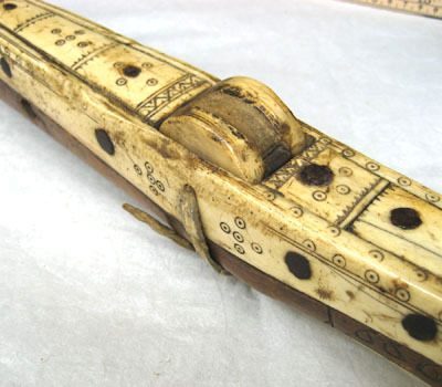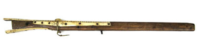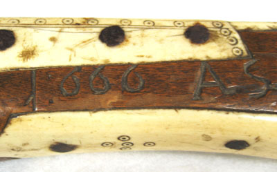Stock av ljusbrunt finådrigt trä. Långsmal, bredare vid nötläge och framtill. Släta sidor, närmast trinagulärt tvärsnitt med platt undersida och rygg. Baktill tvärt avslutad. Nöt av ben fäst med skinnrem knuten på stockens undersida. Nöten dekorerad med skurna linjer i fyra grupper om tre i varje. Runt nötläget förstärkningar av nitade benplattor, dekorerade med skurna cirklar och linjer, på stockens ovansida även med tvärgående tandning. Sidoplattorna 380 mm långa. Framtill skjuter plattorna ut, upptill 45 mm, nertill 40 mm. 70 mm från framkant ett genomgående hål för bågens fästning. På undersidan bakom nötläget rektangulär urtagning, L 80 mm, för avtryckaren, som saknas. Strax bakom urtagningen en inslagen stålten, 15 mm lång med cirkulärt tvärsnitt. Framtill på stockens sida inristat "1666 AS", baktill ett spegelvänt N.