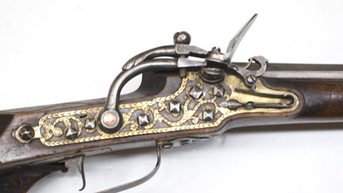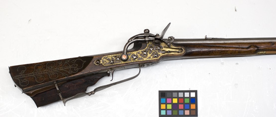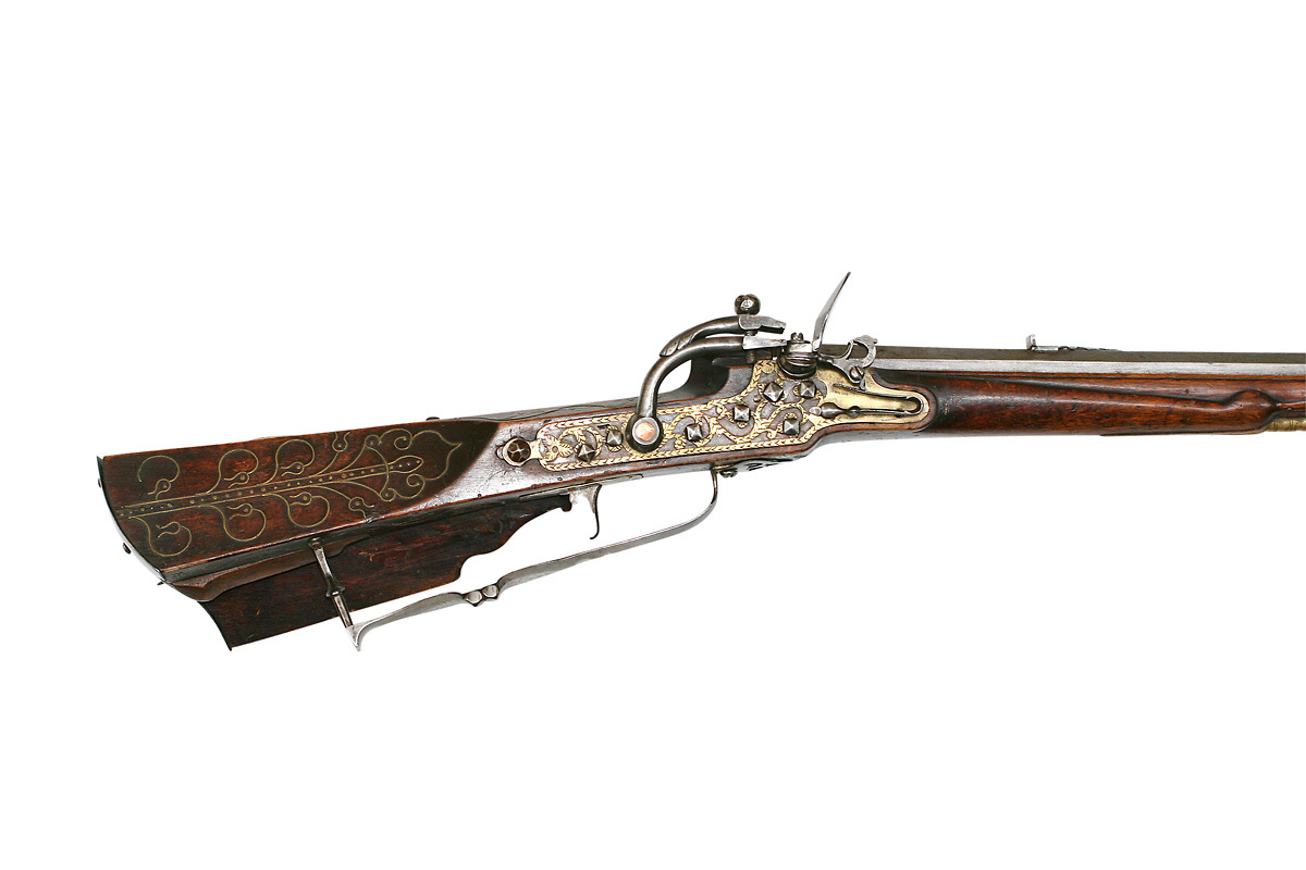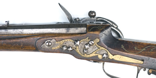 Åttsidig pipa av stål med inläggningar av mässingstråd i form av växtornament. Riktmedel: Ståndsikte av stål med profilerad, framåtriktad arm, stolpkorn av mässing. Fästning: Två häften. Pipan fäst med krysskruv och ett pipstift. Snapplås, springlås av baltisk typ. Plant låsbleck av tysk typ, bakåt avsmalnande i två fall. Låsblecket täckt av en genombruten mässingsplåt med punsad dekor, fäst med kvadratiska stålnitar. Böjd hane med lös överkäke med profilerad bakre del. Käkskruv med runt, kraftigt huvud. Nötskruv av koppar. Rund fängpanna, vridbart eldstål med åsad rygg, eldstålsfoten genombruten i form av en drake. Fästning: Två låsskruvar med krage nedanför huvudena. Rak avtryckare. Rektangulärt avtryckarbleck av mässing. Brun helstock av björk med kolv av tysk typ med kolvlåda på stockens undersida och vinge med snidad volut. Inläggningar i form av bladornament av mässingstråd och stift. Bakplåt av stål fäst med två skruvar. Sidbleck av stål, täckt av genombrutet mässingsbleck med punsad dekor, fäst med stålnitar. Tre profilerade rörkor av mässing. Varbygel av stål, bakre armen tvådelad, bygeln plan och insvängd på mitten, främre armen avbruten. Tillbehör: Laddstock av trä (ej ursprunglig).