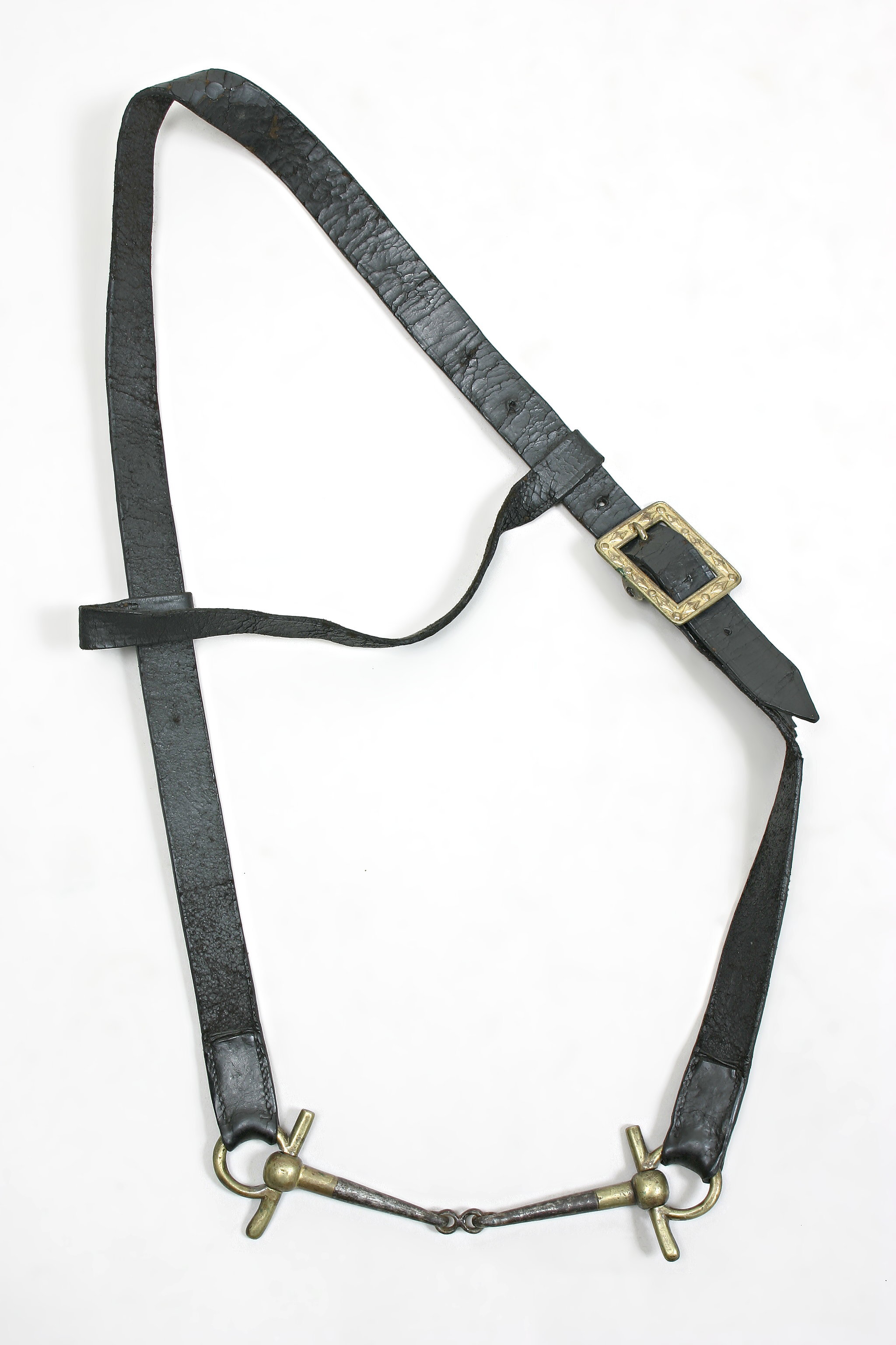 Tränsbett i tre stycken av stål. Öglan för tyglarna samt ett stycke in på bettet är förgyllt. Resten är förtent. På ledkulan vid ändarna två ingjutna cirklar i varandra. Sidostycket, övergående i nackrem med påträtt pannband. Allt av svart läder. br. 28 mm. På ena sidostycket en rektangulär, förgylld sölja med chevronger och pärlornament. Vikt: 335 g.