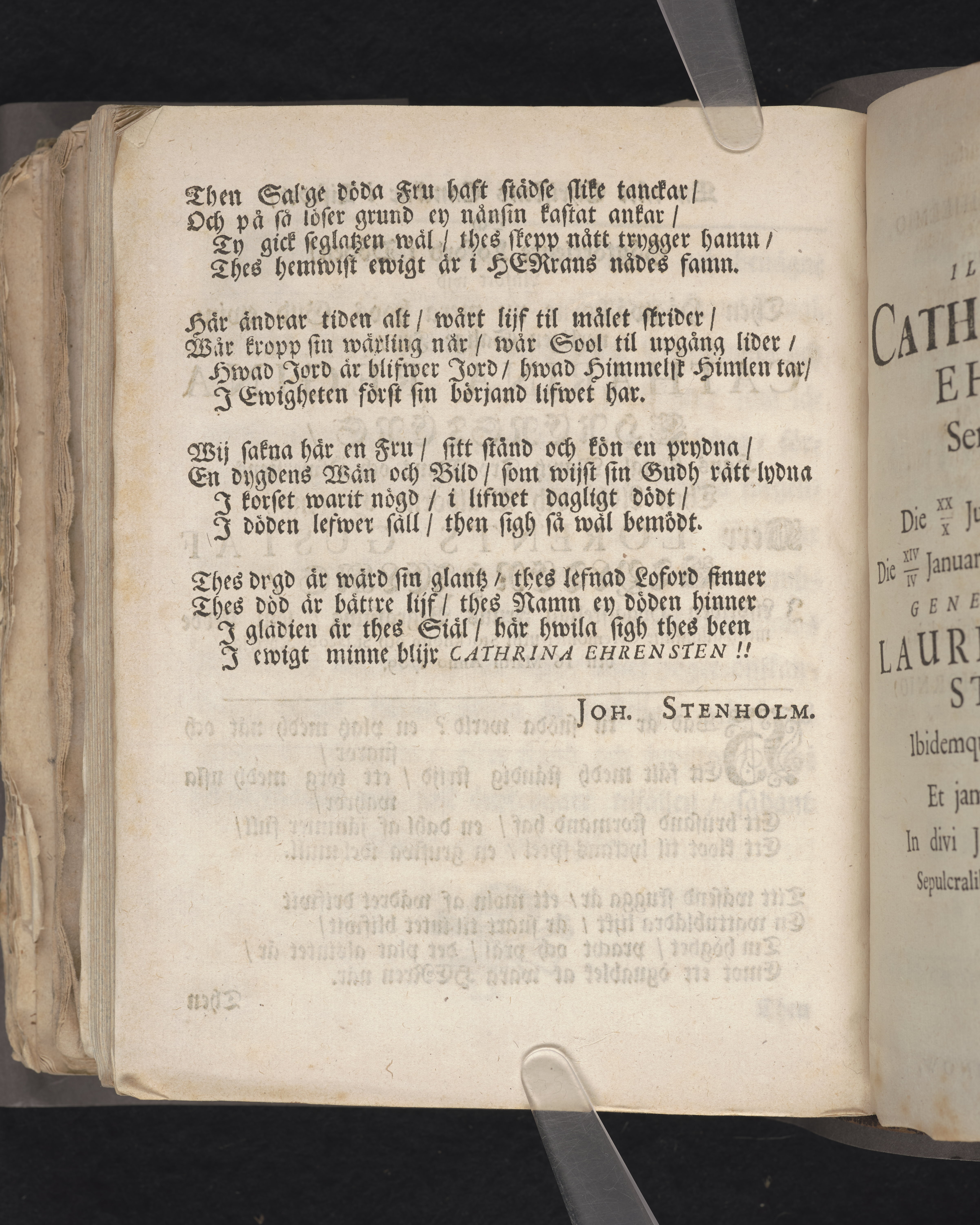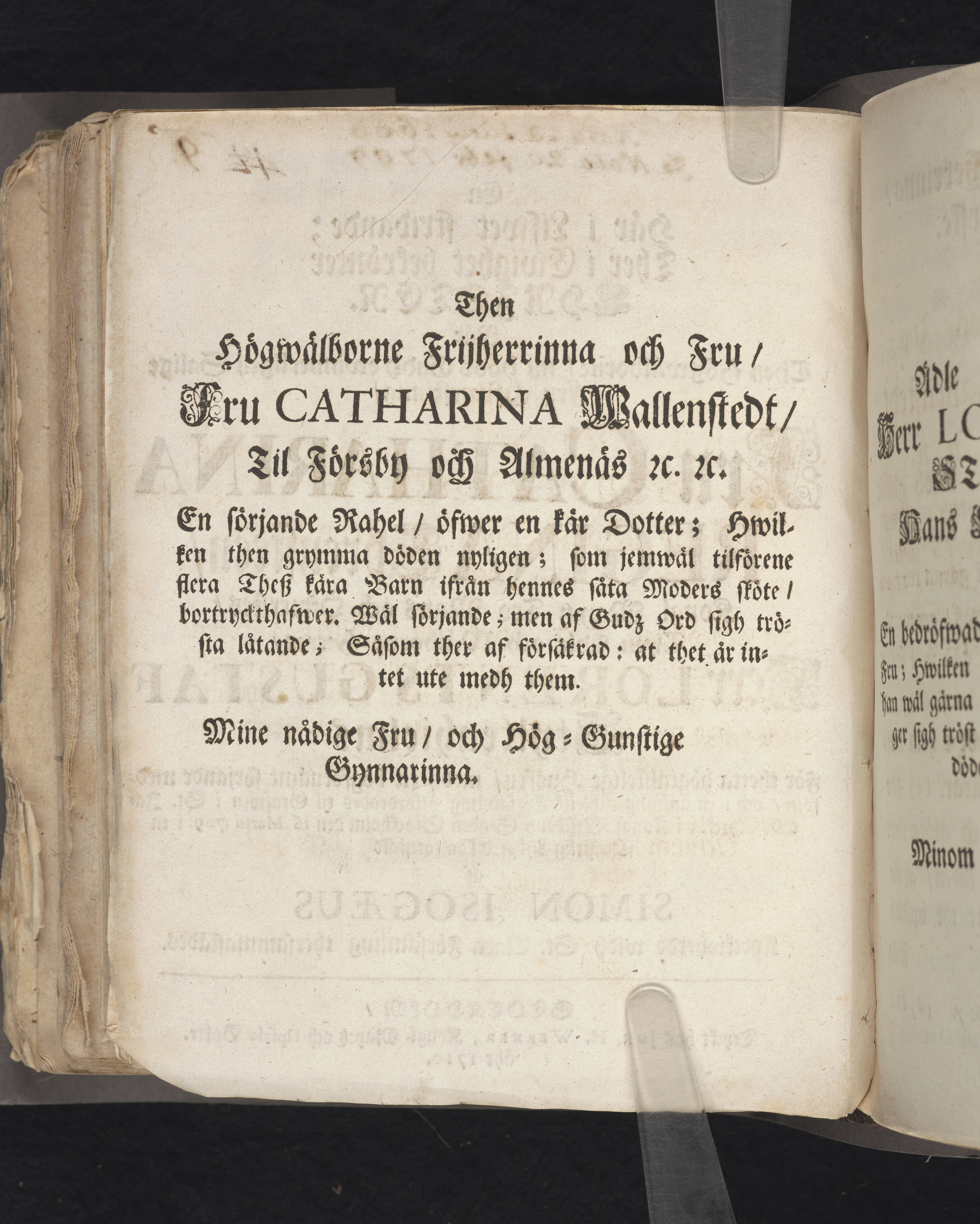 En här lifwet stridande; ther i ewighet bekrönter christen. När then högwälborne, nu hoos Gudh ewinnerligen salige ... Catharina Regina Ehrensteen, kongl. may:tz tro mans och öfwerstes ... Lorents Gustaf Styltenhielms för thetta högtälskelige husfru, medh ett högförnämt sörjande medfölje, och i en ansenlig tahlrijk församling befordrades til grafwen i St. Jacobs kyrckia i kongl. residentz-staden Stockholm den 16 martii 1709. i en christelig lijkpredikan förestäld af Simon Isogæus ... Stockholm, tryckt hos Joh. H. Werner, kongl. may:tz och Upsala boktr. åhr 1710.