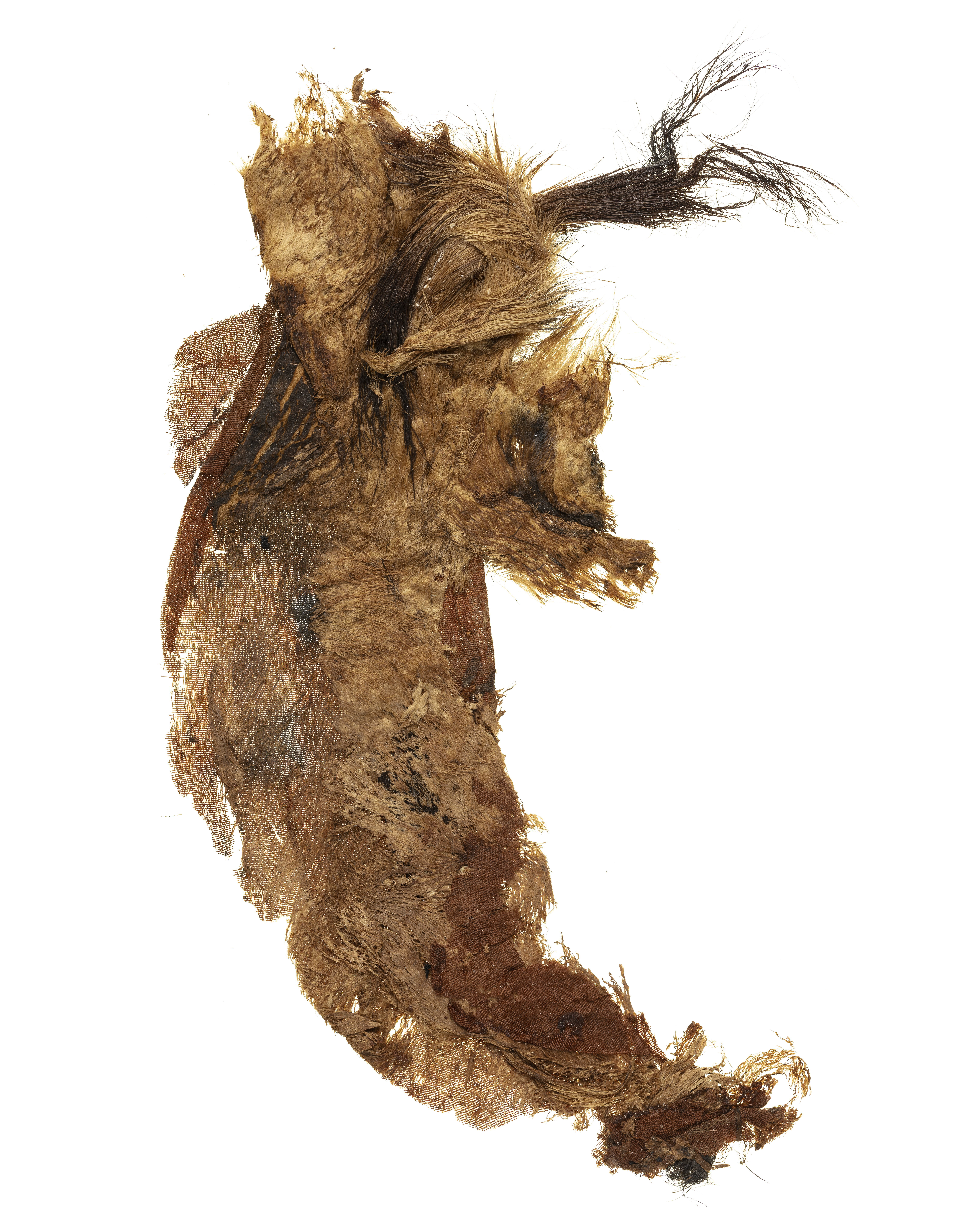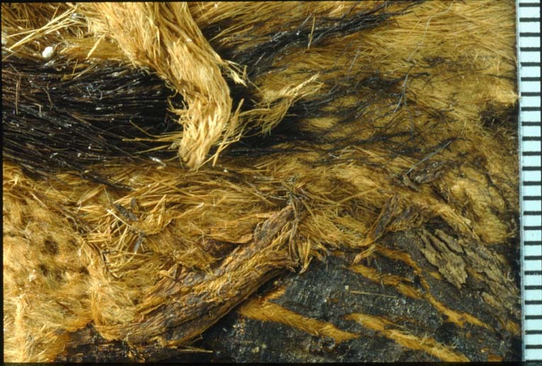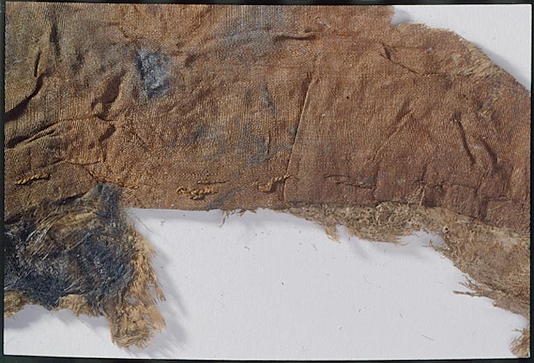 Fragment av skinn och tyg i två delar (se nr 32970). Fragment av skinn med kvarvarande päls. Pälsen ursprungligen vit med längre, bruna tofsar (=hermelin). Skinnet sammanhängande med tunt siden i varprips. Såsom fragmentet är fotograferat är varpriktningen vertikal. Fragmentet kommer från mantelns nedre fåll. De ursprungliga färgerna delvis förändrade, fragmentet numera övervägande brunt. Fragmentet ingår i en samling fragment tagna som prov ur drottning Kristinas kista vid gravöppningen den 13-14 december 1965. Manteln: Varp: 2-trådigt silke i s-snodd. Trådtäthet: 68 trådar/cm. Inslag: Parallellt liggande fibrer, d v s snodd saknas. Trådtäthet: 30 trådar/cm. Material: Silke. Teknik: Varprips, fr. gros de Tours. Kommentar: Långa förstygn håller fast pälsen mot taften. Nuvarande färg är brun. Sysilket: 2-trådigt silke med z-snodd. Förmodligen samma som 32972, 32979,32980 och 33004. Päls: Pälsen består av ljust beige päls och 2 stycken svarta hermelinsvansar. Pälsen är fastsydd mot taften, se ovan.