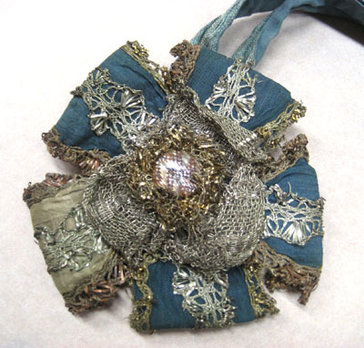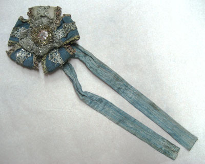 Rosett av fem dubbelvikta, blå sidenband på grovt linne. Sidenbanden dekorerade längs mitten med band av silverlan och silvertråd, bredd: 25 mm. Sidenbanden kantade med guldband av guldtråd och guldlan, bredd: 10 mm. Dekorrosett på mitten av tre dubbelvikta band av silvertråd och silverlan, bredd: 35 mm. I mitten en knapp klädd med silverlan och silke i ett sicksackmönster, diameter: 20 mm. Knappen omgiven av en franskant av guldtråd och guldlan, något ihoptryckt, bredd: 10 mm. På baksidan en rund bottenplatta, troligen av skinn, klädd med blå siden. Plattan mäter i diameter: 43 mm. I mitten två knytband av blå textil, bredd: 21 mm.