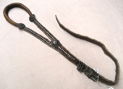 Betselstängerne försilfrade, men Pucklorne, som förbemälte är af purt Silfver, därtill 2ne Bouquetter af SIlfver, hvitt Silke och andre slags Couleurer band. På Hufvudstället och Handtygeln fattas 4 st Silfver Pucklor eller Naglar.
