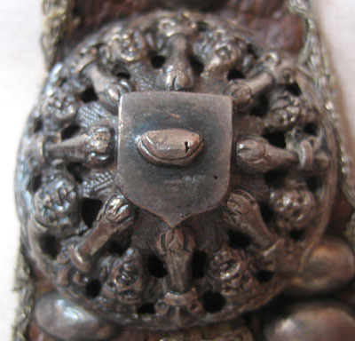 Förbögeln af guld saffian med en silfver galon och öfver slagen med silfver stifter pucklor och söljor af drifvet arbete