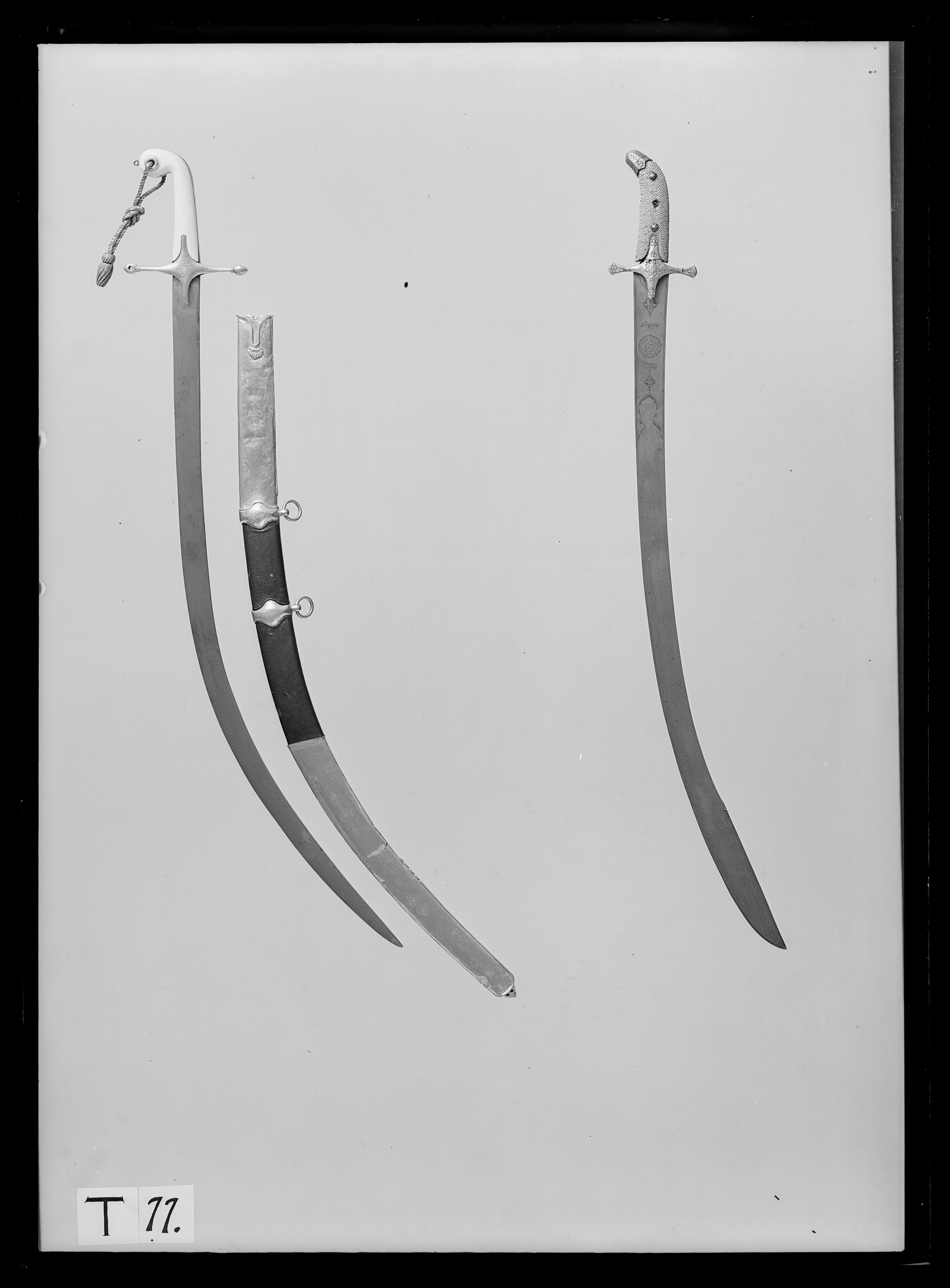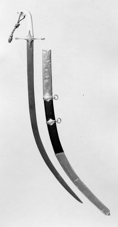 Fäste av guld. Raka parerstänger med knoppformiga ändar. Genom främre parerstångens knopp ett genomgående hål och styrskenor med graverad smal kantbård. Mitt på krysset graverat vas- och blomornament, samt på insidan tre stämplar, en "22:K". Kaveln klädd med plattor av elfenben. Upptill framåtböjd och något vidgad med guldskott hål för portepé. Runt fram- och baksidan slät skena av guld. Klinga av stål 31 mm bred, böjd och eneggad. Tillbehör: Portepé av guldtråd och purpurfärgat silke.