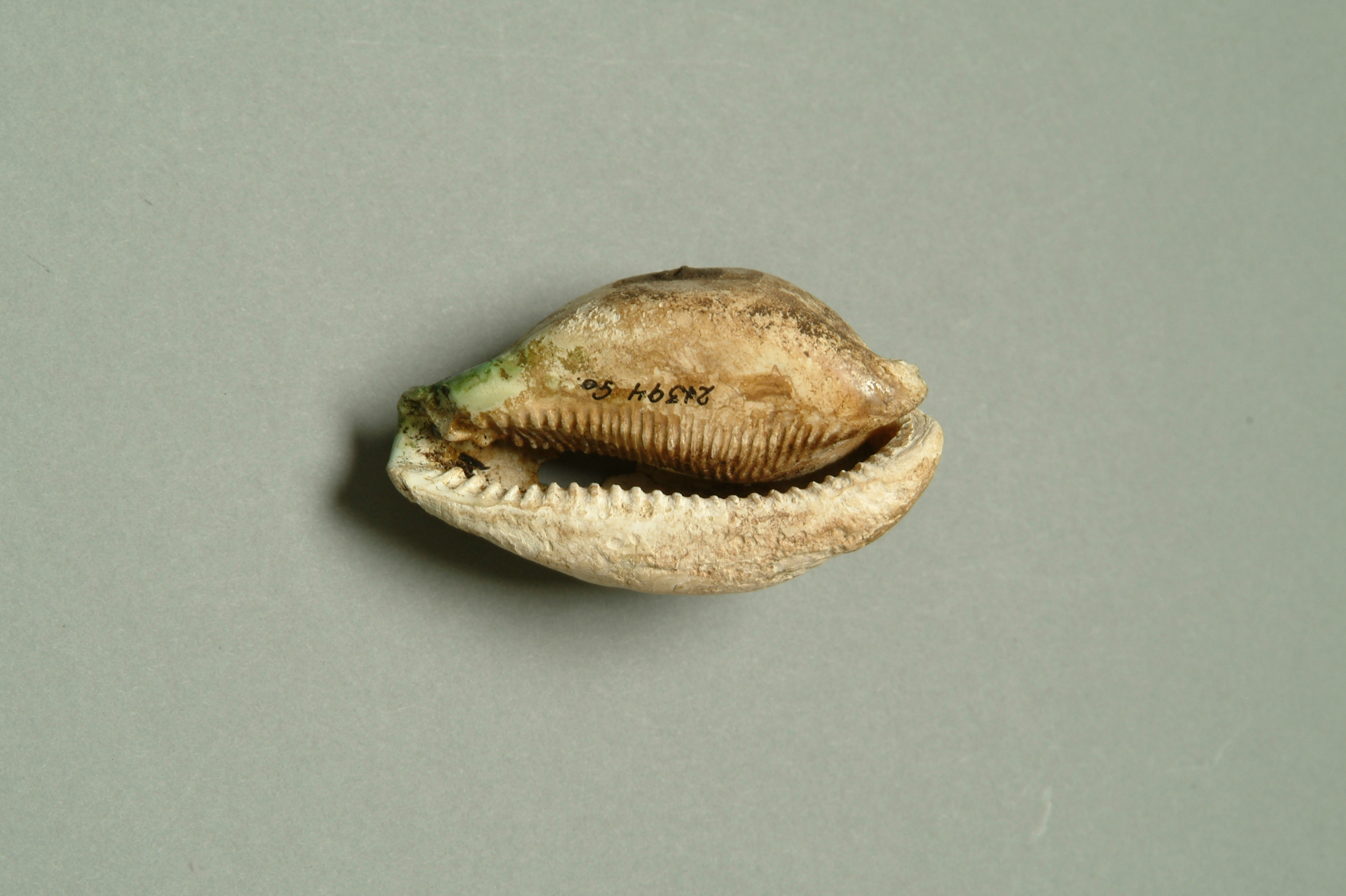 Kaurisnäcka med ärgning i ena genomborrade änden efter bronsring. Har ett hål i skalet.