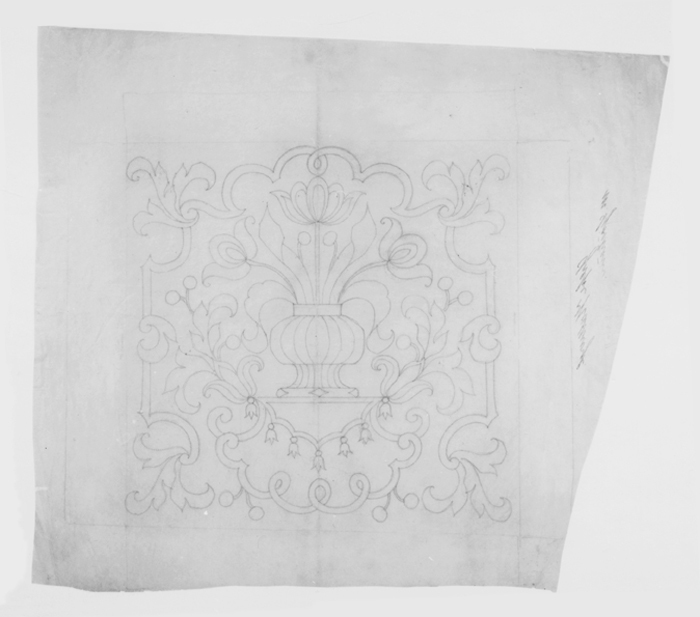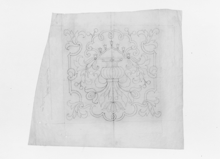 MÖNSTERFÖRLAGA, till möbelklädsel. Utförd på transparent papper, utgörande förlaga till möbelklädsel till inv nr. Gr.VI:II:A.a.11. (för beskrivning se Hallwylska samlingen, Gr VI, text s.330 f.f.) Påskrift: "Grefve Hallwyl. M Sjöström" Punkterade linjer (blått pulver i hålen) Mått: H 60,6 cm B 66,9 cm Gåva 1943 av arkitekt Gustaf Clason (se protokoll 54 º 4)