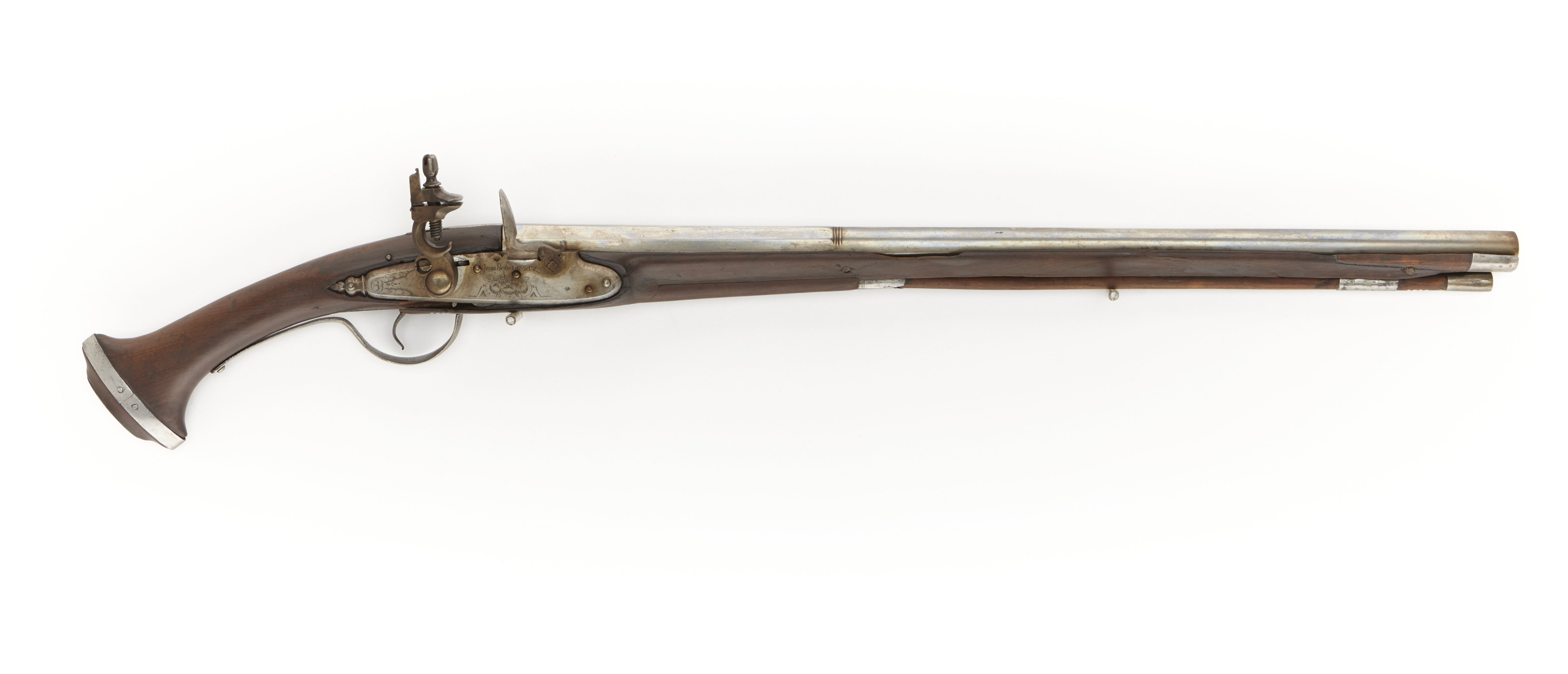 Rund, slätborrad pipa av stål, med åttkantig kammare. På kammarens undersida stämpel med stjärna, framför den ett "N" . Två häften. Snapplås i flintlåsform, hakspännlås med plant låsbleck med fasade kanter. Baktill balusterformad spetsflik. Graverad dekor. S-formig hane med lös överkäke. Avtryckaren bildar halvspänn framför hanen. Kantig fängpanna nedanför vilken är graverat "Jean Preuot a Metz" (se Stöckel I s 248). Eldstålet har åsad rygg. Invändig eldstålsfjäder. Brun helstock med oval kolvring av stål kring kolvänden. Centrumplatta av stål, oval. Ristade konturer för sidbleck och oval punsad dekor. Två rörkor av stål, näsband av stål. Skålformig varbygel av stål. Tillbehör: Laddstock av trä, doppsko av stål. Märkt: 33 bakom låsblecket, stanstyp 5376.