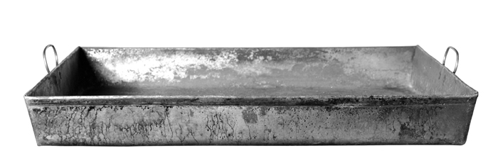 LÅNGPANNA (ugns-) Av järnplåt. Rektangulär, med skarpa hörn, på kortsidorna i varje hörn en omvikt spetsig hörnflik, snett uppstående kant, plan botten samt två handtag; kring brädden en utvikt smal kant; handtag, ett i vardera änden, avlånga, rundstaviga samt rörliga vartdera i en omvikt plåtflik, fäst med två nitar. Höjd: 6,6 cm.; längd: 52,7 cm.; bredd: 47,4 cm.