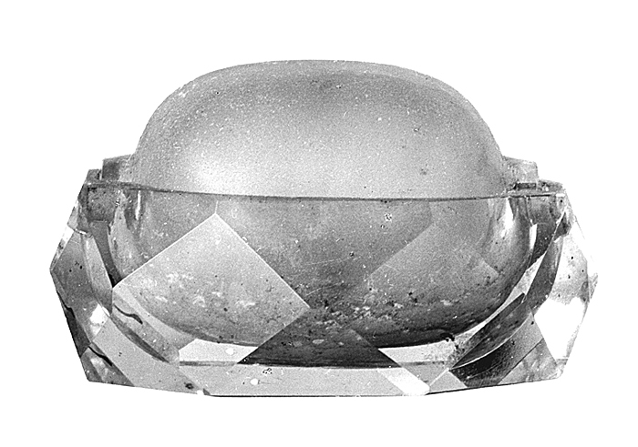 Bestående av en i en kopp svängbar rulle. Rullen avlång med rundade ändar, i vardera av dessa en kort tapp, på vilka tappar rullen roterar i lager i koppens överkant. Kopp oval, fasettslipad vulstig kant och plan botten. Tillhört inventarierna på Walther von Hallwyls privata kontor, inrymt i Hamngatan 4, Stockholm, 1909 - 1921; därefter på Wilhelmina von Hallwyls, f. Kempe, kontor där från sistnämnda år t. o. m. 1930.