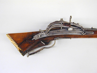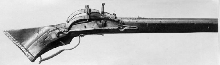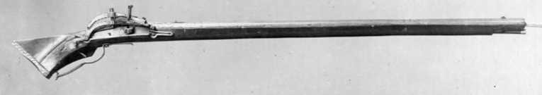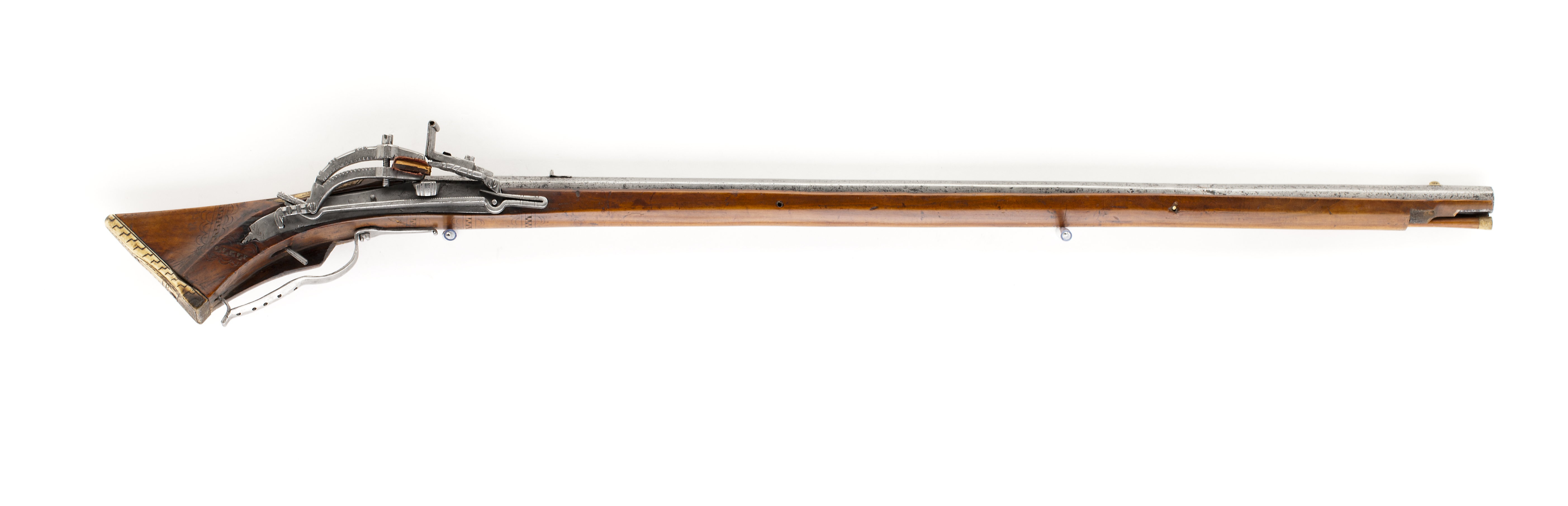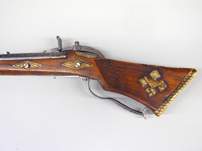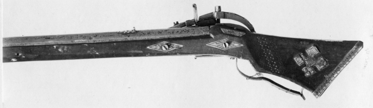 Åttsidig, slätborrad pipa, endast grovbearbetad utsida (rostskadad). Nedåtböjt svansskruvblad med tvärt avslutad ände, springa mellan blad och pipa. Riktmedel: Ståndsikte av stål (ersatt?, finare arbetat än pipan i övrigt). Stolpkorn av mässing. Fästning: Ett, ursprungligen två häften (det bakre saknas). Pipan fäst med krysskruv underifrån samt ett ej ursprungligt pipstift av trä. Snapplås, springlås med utvändig slag-hanfjäder. Plant låsbleck, baktill ett litet blad och därframför en tvärgående X-skrafferad bård. Böjd hane med inlaxad överkäke, inskurna "tänder" i form av hack på insidan, på överkäkens ytterkant tre fasningar och däremellan tre knappar. Fot i nästan rät vinkel med filad och ristad dekor. Hanstudel med tre H-liknande figurer. Rektangulär fängpanna med två dubbla filade lodrätta streck på gaveln. Fängpannelock med filad dekor på kanten, omvändningseldstål i två halvor, rörformig vulst upptill, spricka-springa i båda sidor. Slagfjäder nedsvängd för främre låsskruven, filad kantdekor. Fästning: Två låsskruvar. Rak avtryckare. Helstock av brunt trä med sluten laddstocksränna, triangulär kolv, dekor i form av bårder av inskurna trianglar, flankerade av dubbla C-formiga bågar, en v-formig bård bakom låset, en sneddad bård på anslaget, tre bårder på kolvens undersida. Kolvkappa av horn med linje- och punktdekor ifylld med svart färg, På kolvryggen en lång platta med trianglar av parallella streck, på vardera sidan av svansskruvbladet plattor med streckdekor. På anslaget en korsformig platta sammansatt av fem kvadrater, var och en med en dekor av koncentriska cirklar. Två rombiska låsskruvbrickor med streckdekor. Näsbandet saknas. Varbygel av stål, bakre armen skålformig och genombruten av 9 runda hål. Främre armen avsmalnande framåt och avslutad med liten volut. Bakstolpen inslagen i kolven, främre armen fäst med krysskruven.