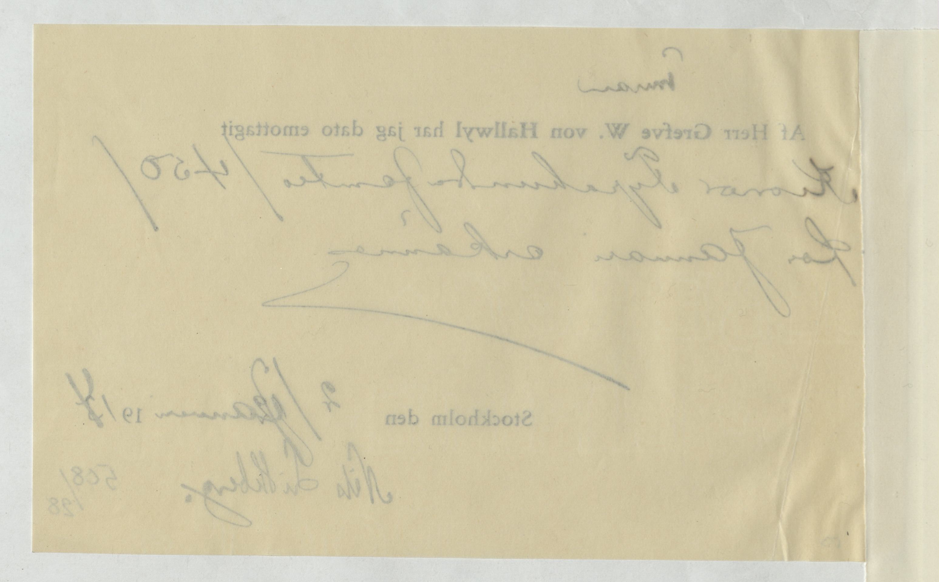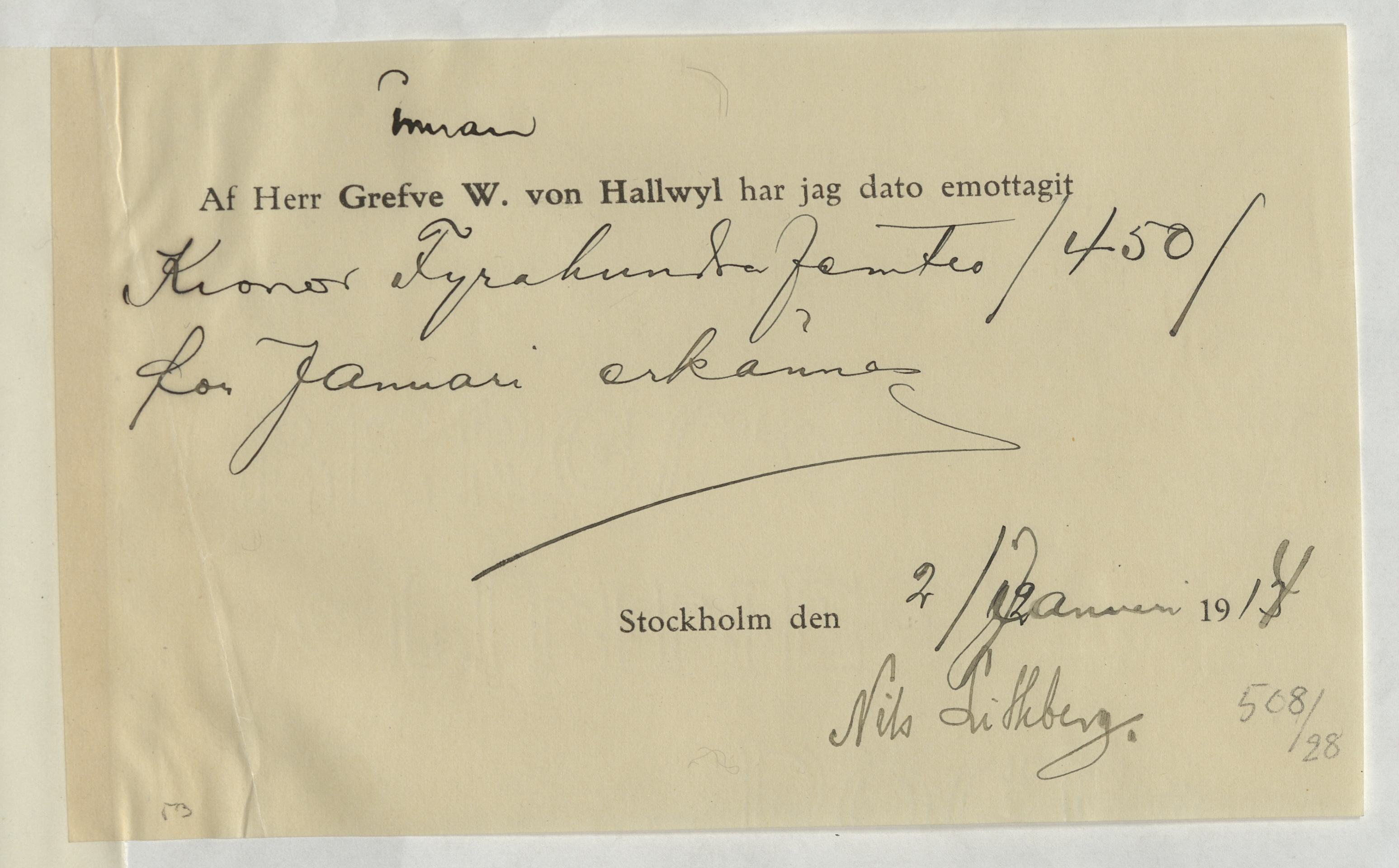 Kvitto gällande pengatransaktion mellan Wilhelmina von Hallwyl och Nils Lithberg. Stockholm, 1914.