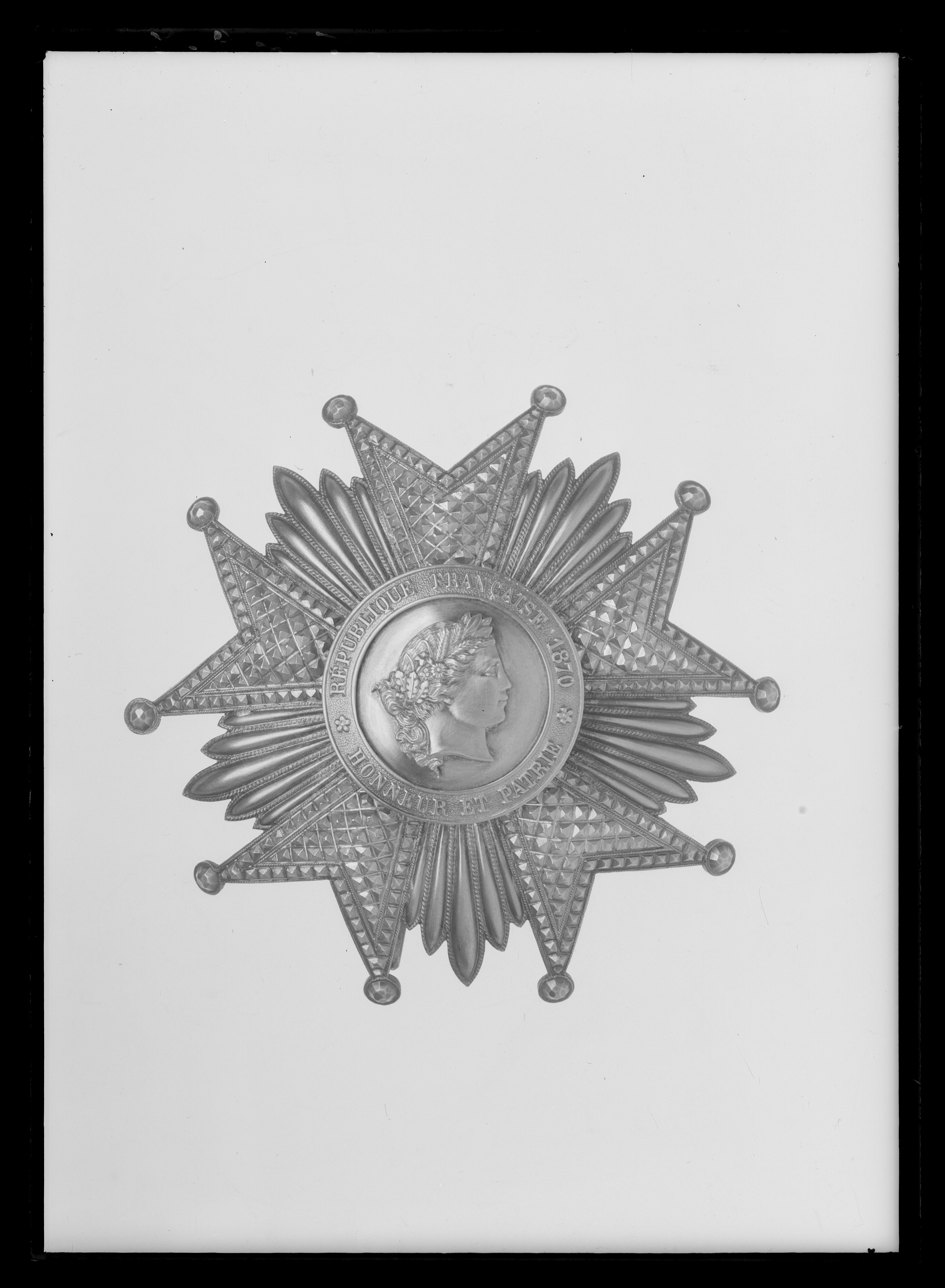 Femarmad stjärna av silver med kluvna armar, fasetterade kulor på spetsarna. Armarna dekorerade med fasetterade fyrkanter, kantbårder i samma utförande. Mellan armarna fem bladformiga rundade strålar med repstavskant. Välvd medaljong, därpå fäst ett kvinnohuvud i relief (republiken). Ring med relieftext mot punsad botten: "REPUBLIQUE FRANCAISE 1870 HONNEUR ET PATRIE". På frånsidan vertikalt placerad säkerhetsnål samt två hakar. På nålfästet otydlig rombiskstämpel.