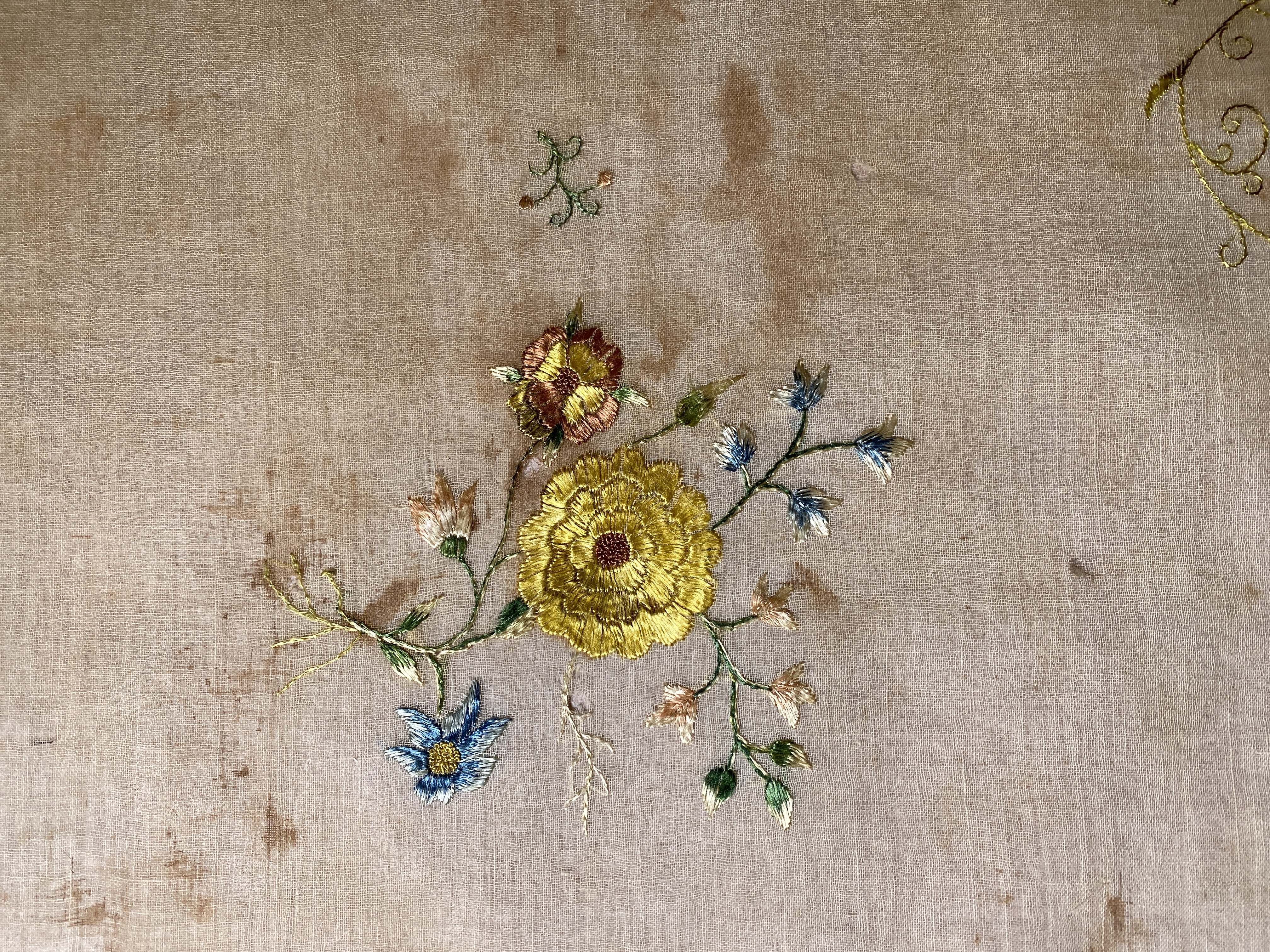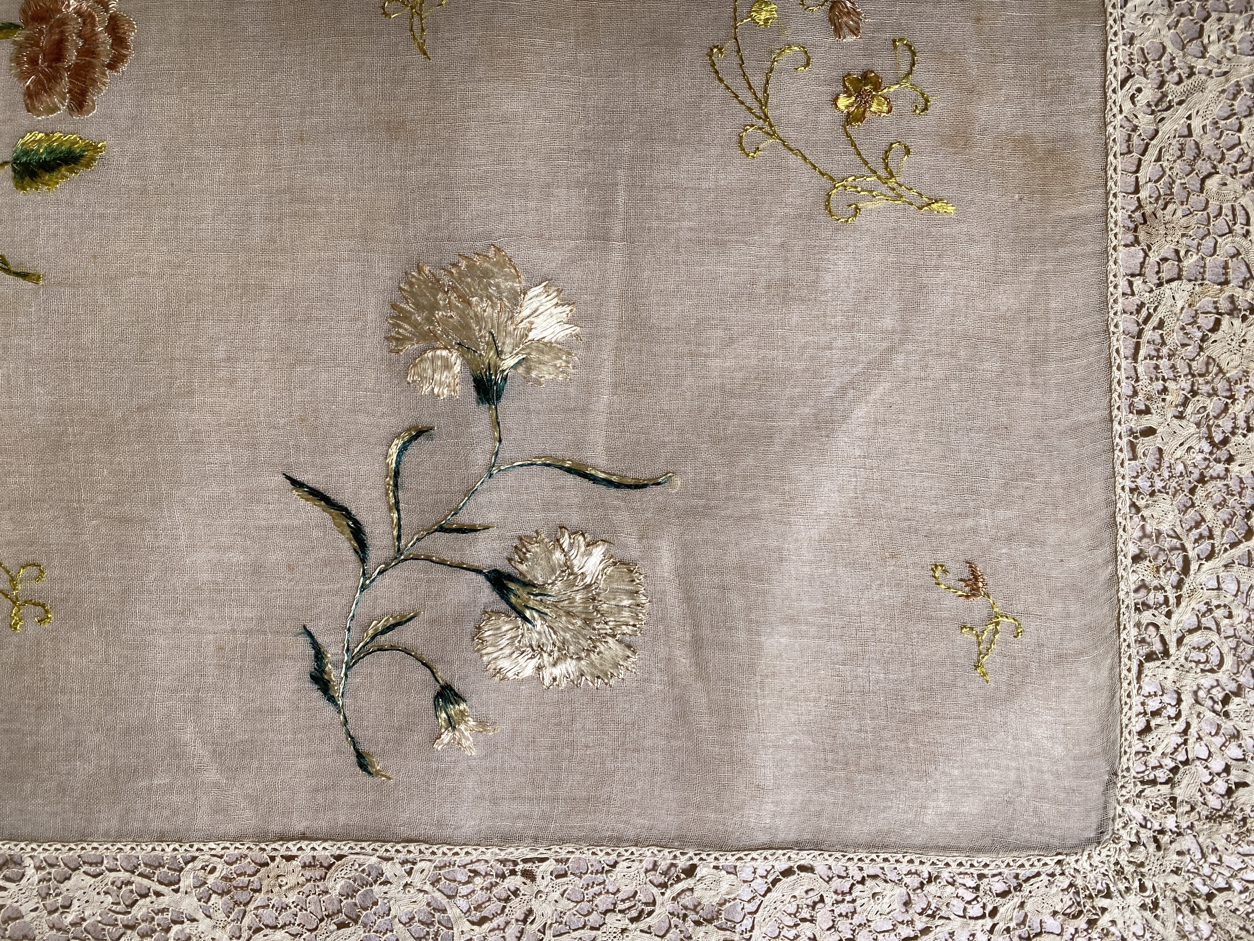 Bomullsmuslin med blombroderi och sydd spets. Deponerad 1942.