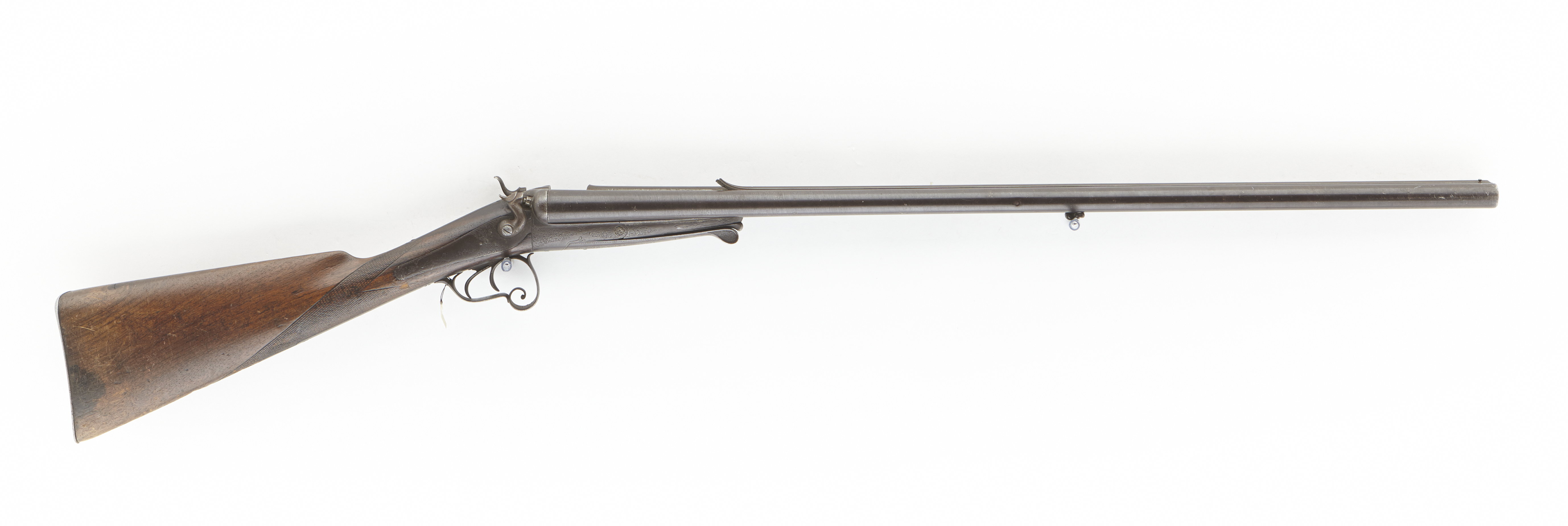 Rund, damaskerad, brunerad, slätborrad dubbelpipa med mellanliggande, skålade spänger. Runt stora pipklacken stämplar, till v HUSQVARNA, otydlig stämpel samt 3565(?), till h krönt fraktur-H samt 16. Mitt under pipan en brunerad rembygel. V. pipa sprängd. Riktmedel: Knoppkorn av mässing. Baskyl av brunera stål med sparsam, graverad rankdekor, vid pipbasen en skålning med graverade strålar. På piplägets h sida stämplat baktill: 3565, vid gångjärnet 16. Främre delen fäst med gångjärn. På undersidan finns en Lefaucheux-nyckel med graverad rankdekor samt nätskuret fingergrepp, på framdelen därunder en åt h vridbar låsnyckel för pipan. Lefaucheux-nyckeln samt baskylens framdel under pipnyckeln är stämplade 3565. Hanlås med bakåtliggande slagfjädrar, brunerat stål(?). Svagt välvda låsbleck med graverad rankdekor samt på h lås en hund och en fågel, på v bleck en springande hund. S-formiga, välvda hanar med graverad rankdekor, nätskurna tumgrepp (avbrutet på h hane). Länk nöt-slagfjäder. Låsblecken invändigt stämplade 3565, delvis dolt av slagfjädrarna. Fästning: En låsskruv från v bleck. Dubbla avtryckare. Avtryckarbleck med lång bakre del, rundad ände, graverad rankdekor. Halvstock av trä (valnöt?), engelsk kolv med kindstöd och nätskuren kolvhals. Beslag av gråanlöpt(?) stål, bakplåt med en liten spets på kolvryggen. På avtryckarblecket är fäst en varbygel med s-formig framstolpe, spiralformigt svängd nederdel, kluven upptill, kluven bakre stolpe, graverad rankdekor. Anmärkning: V pipa spräng i patronläget, bakre delen (ca 30 mm) saknas, överspången uppfläkt 160 m m, därav saknas ca 140 mm, h hanes tumgrepp saknas, bakre rembygeln (knapp?) saknas. Charnirbulten skadad.