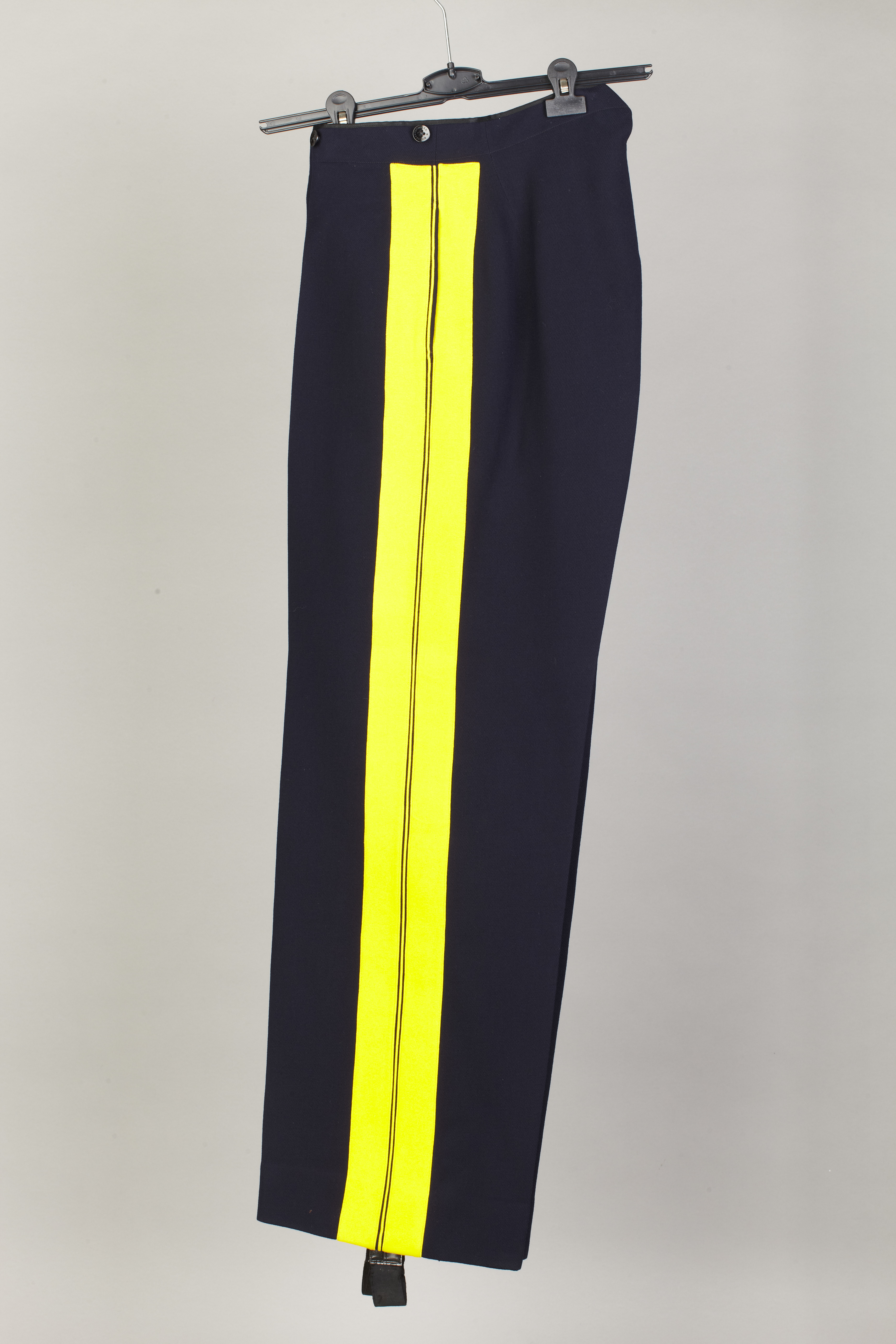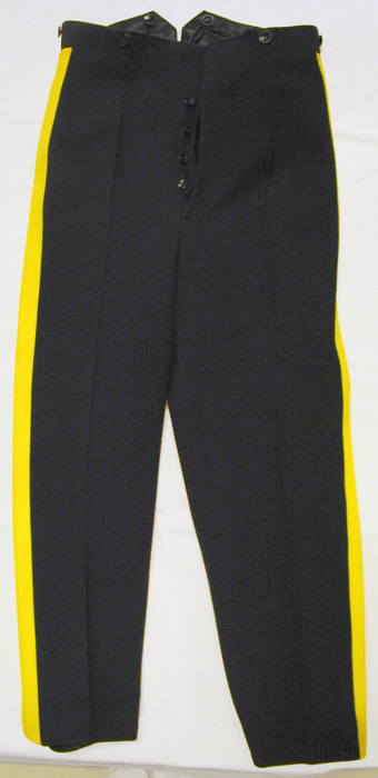 Långbyxor av mörkblå diagonal knäppta med gylf med fyra knappar d: 14 mm med firmanamn: "MILITÄR EKIPERINGS AB". Linning med fyra lika knappar d: 17 mm. Mitt bak v-format sprund. Fickor i sidsömmen, utmed dessa på båda sidor 39 mm bred gul klädeslist, mellan dessa smal gul passpoal. Nedtill hällor, 31 mm breda med rektangulära skoningar i kanterna av lackskinn med knapphål. Fästade på byxbenens insidor med knappar d: 14 mm. Foder i linningen av svart siden. Baktill två knappar d: 17 mm samt hängare. Vid sidsömmarna på linningens insida smala hällor knäppta med tryckknappar. Framtill spänntamp med firmaetikett: "Militär Ekiperings AB//KUNGL.HOFLEVERANTÖR // Stockholm, den 24.11.1938 // Herr H.K.H. // Prins Gustaf Adolf ". Fickor av svart bomull.
