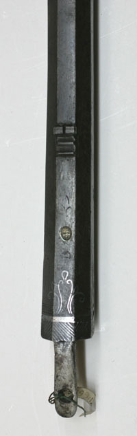 Åttsidig, slätborrad pipa med trumf och bandformiga silverinläggningar på kammaren och vid mynningen. På pipans ovansida inslaget "b" och en pil samt en oval mässingplatta med en stämplad vapensköld för adliga ätten von Feilitzen. Riktmedel:Ståndsikte av stål, stolpkorn av silver. Fästning: Två häften.