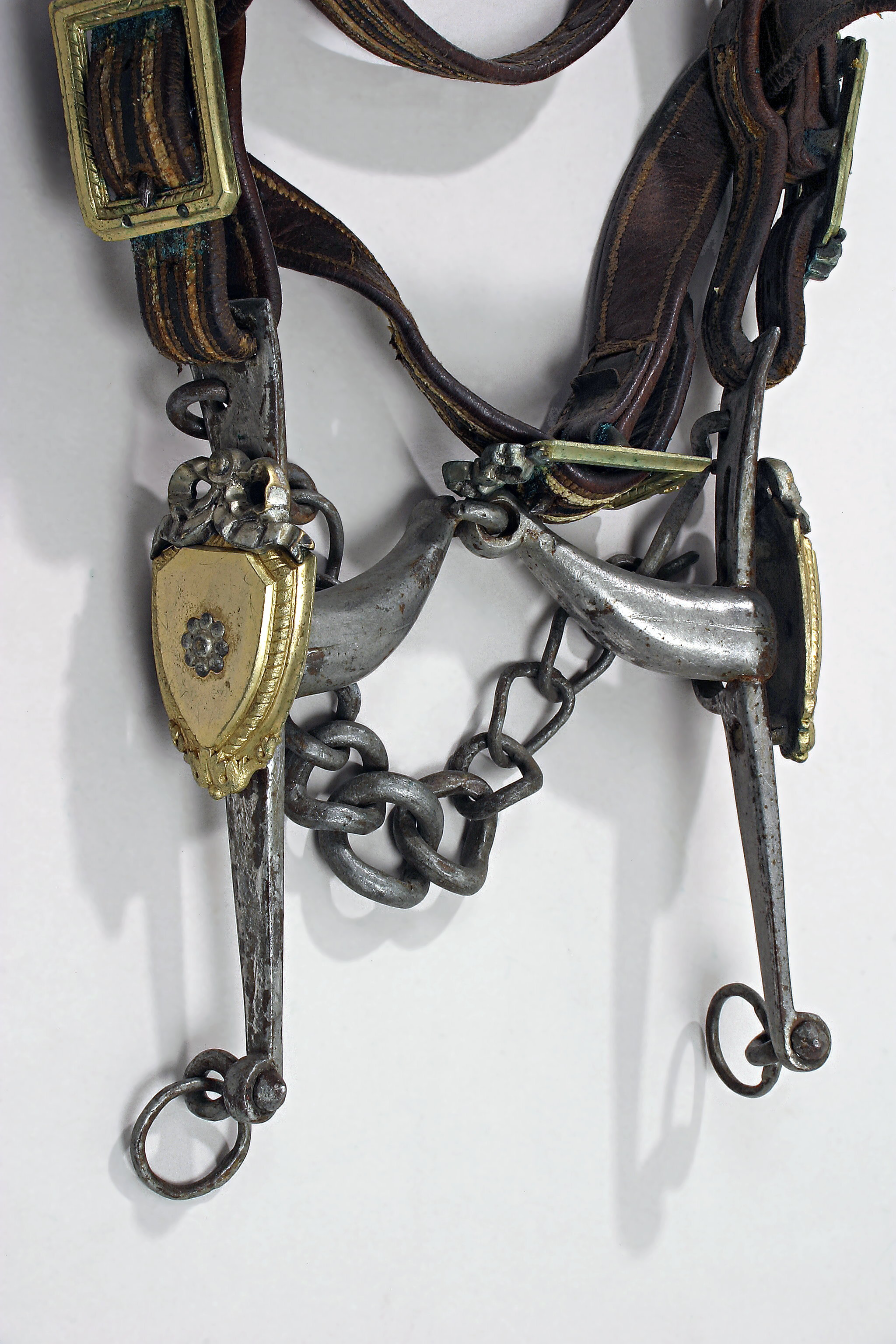Stångbetsel av förtent stål. Dunhalsformigt, rörligt bett. Sköldformad buckla av förgylld, gjuten mässing med försilvrad, fastgjuten rosett upptill. Lekare med ring för tyglarna. Upptill kindkedja med en krok samt rektangulärt hål för sidostycket. Huvudlag av läder med dekorsömmar samt imålade ränder av tjockt lager vit färg. Mellan ränderna mittfält av svart läder. På nosbandet ett långsmalt, fastnitat bleck av förgylld mässing med försilvrade nithuvuden och rosett. Sidostyckenas bredd 24 mm, upptill och nedtill fästade med rektangulära söljor av förgylld, gjuten mässing. På söljorna fastnitade, försilvrade rosetter. Sidostyckena övergår i nackrem, vilken är delad. Den andra hälften är utdragen och övergår i käkrem, vilken har två likadana söljor. Fästade på sidostycken och stjärnrem är två rektangulära skygglappar, 125 x 115 mm. Dessa är kantade av gjutna, profilerade och förgyllda ramar. Mittfält med Medusahuvud, förgyllt, omgivet av försilvrade strålar på svart läderplatta. Mellan ram och mittbild ett 8 mm brett vitfärgat band. På huvudlagets h. sida en rosett i form av runduddad kokard av blått silke, snörmakeriarbeten, guldfolie och guldtråd. Nedtill frans med två rader pomponger, linne- och guldtrådssnoddar. Pannband och stjärnrem inlindade i rombiskt mönster av flätade blekt ljusblå silkes- och guldband.