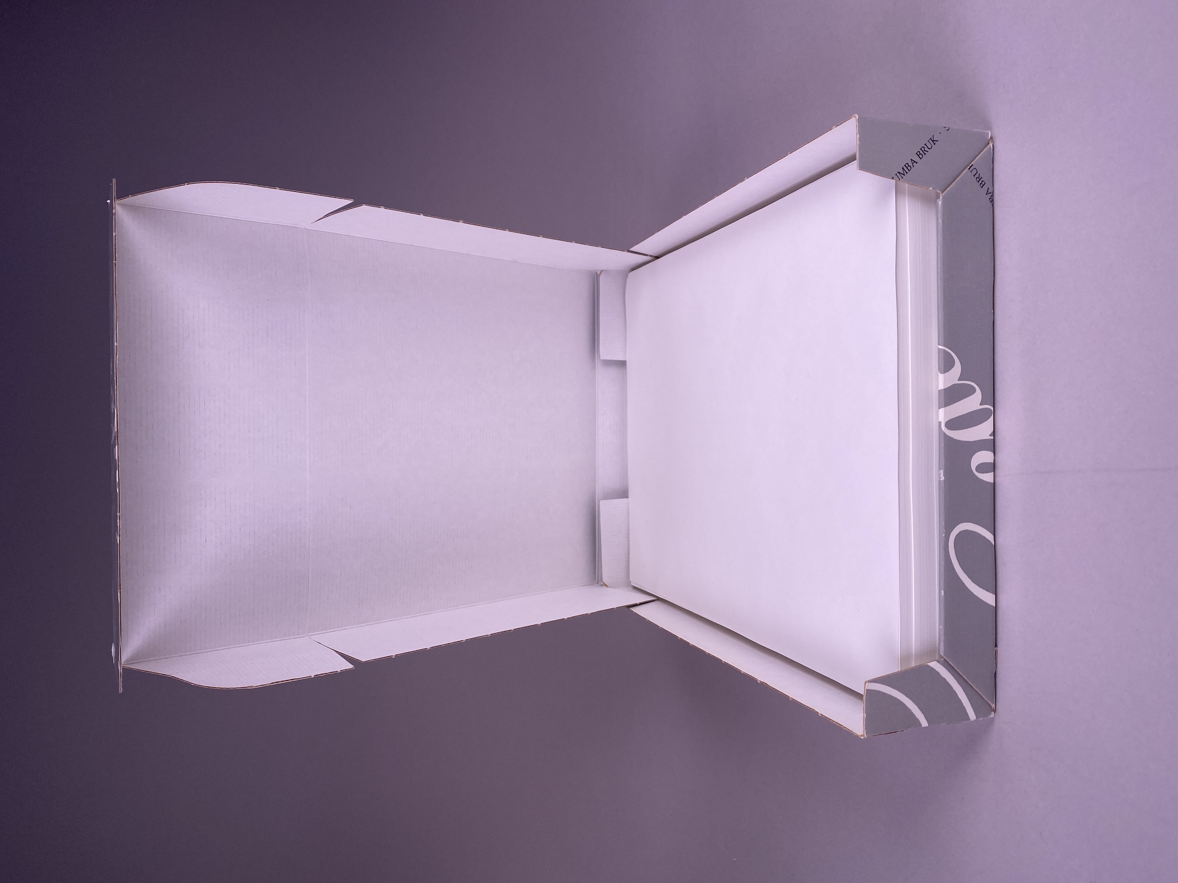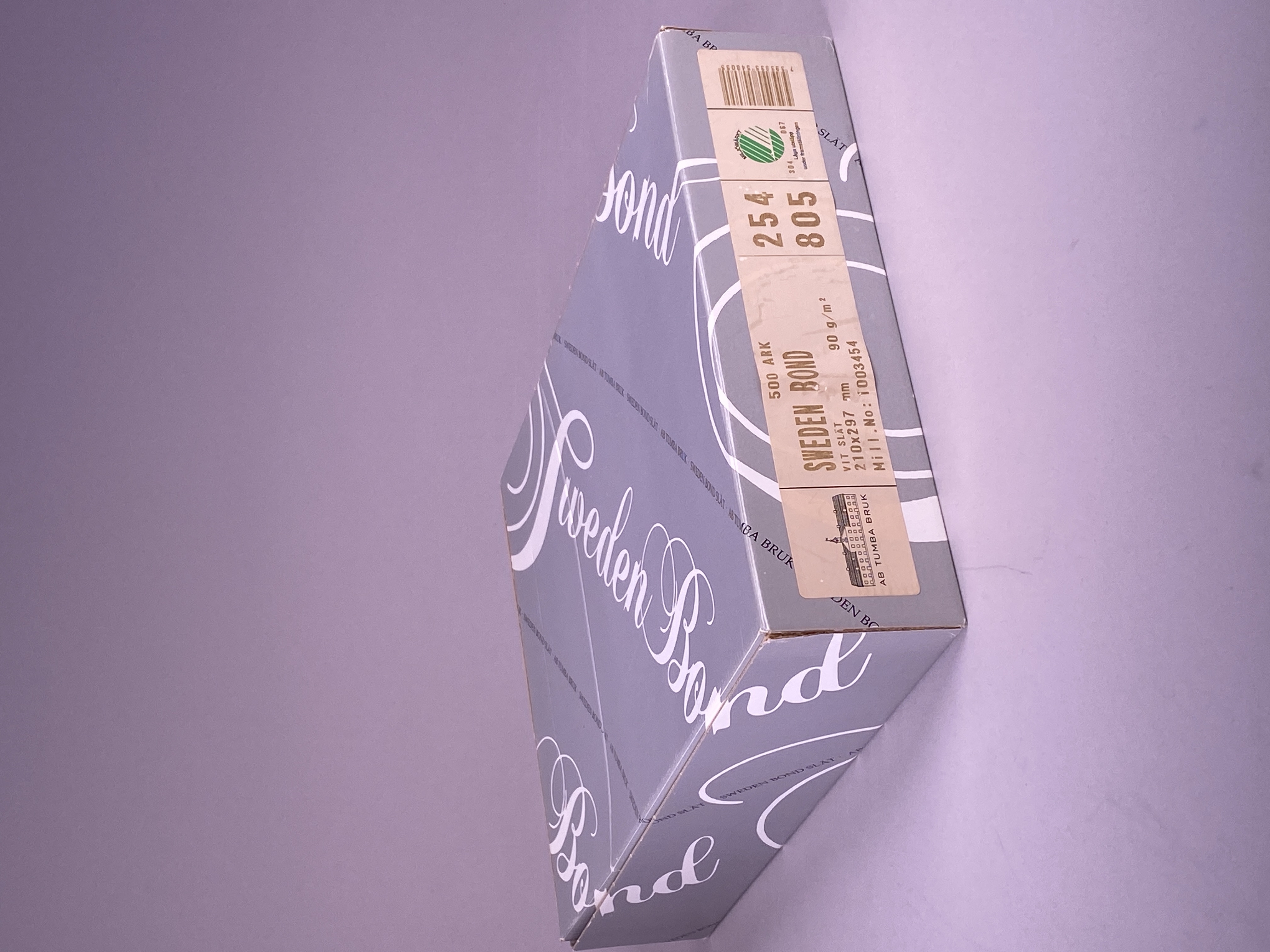 En grå wellpapplåda innehållande 500 pappersark "Sweden Bond", bruten förpackning (det är okänt hur många pappersark som saknas). Vit slät, 210x297 mm, 90 g/m2. Serienummer 254.805. Mill. No: 1003454.