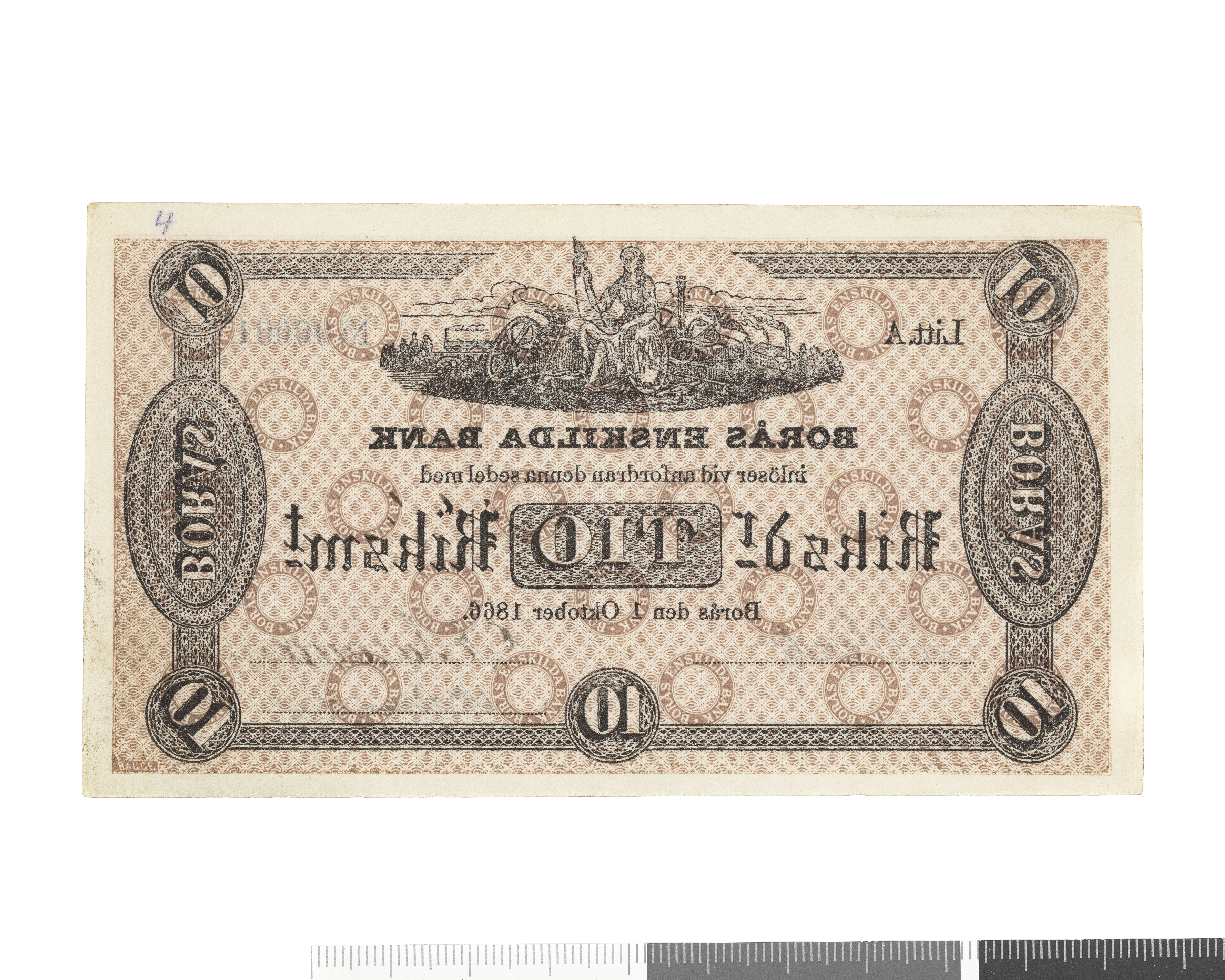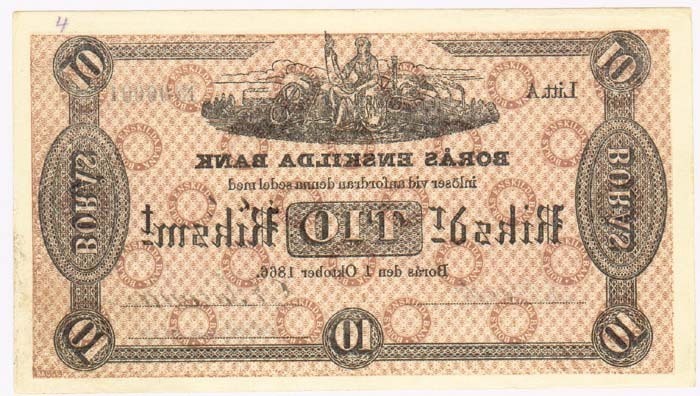 Upphov: Borås Enskilda Bank. Media: Bonnevier, Helena. Ekonomiska museet - Kungliga myntkabinettet/SHM, (PDM) Upphovsrätten till detta verk har gått ut och är därmed fritt att använda på alla sätt. Ange gärna upphovsperson om denne är känd.