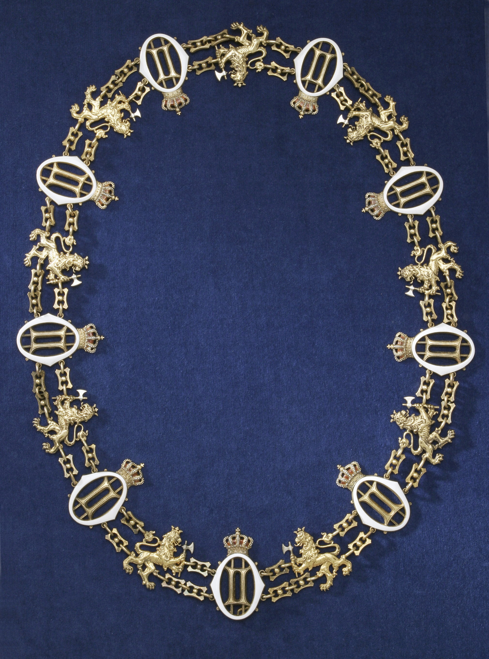Sammansatt av 18 länkar av förgyllt silver(?) och emalj, nio länkar med namnchiffer, Oskar II, vitemaljerat O omslutande II, krönt av kunglig krona med rött foder och vita pärlor. Nio länkar i form av yxbärande gyllene krönta lejon, yxbladet av silver. Baksidorna släta, på baksidan av ett O en hake för tecknet, på baksidan av två lejon krokar. Länkarna förbundna av kedjor bestående av ovala ringar och fyrkantiga plattor medinsvängda sidor, mellan varje stor länk en platta och två ovala ringar, vartannat O har nertill två plattor och tre ringar. Kedjan häktas ihop med två fasta hakar på baksidan av ett lejon.