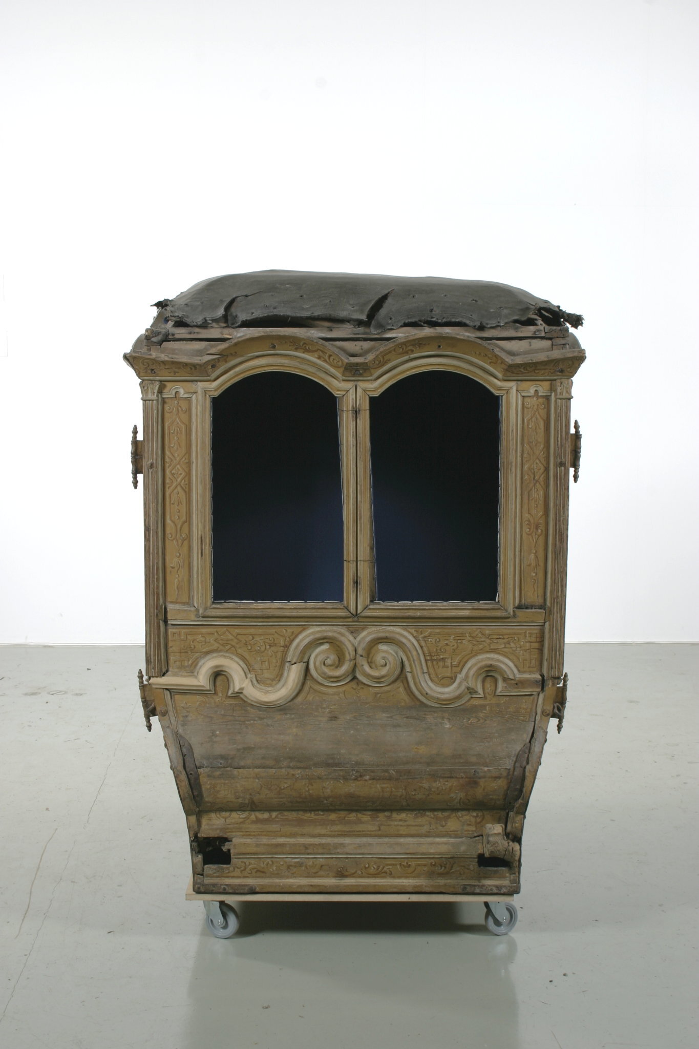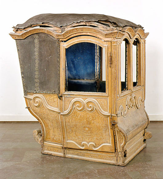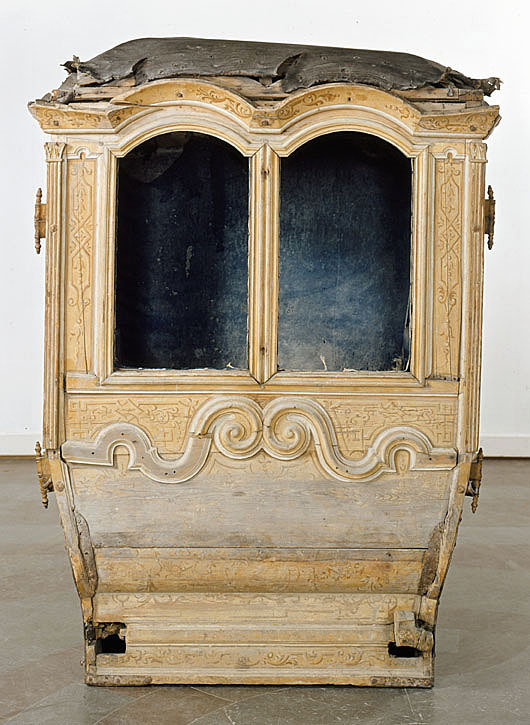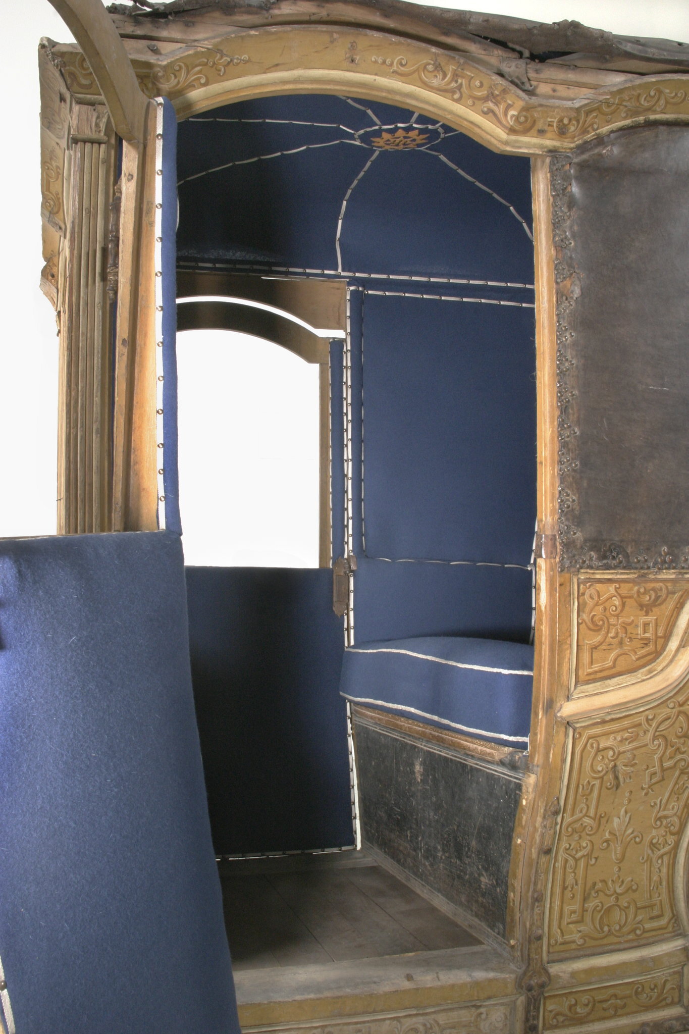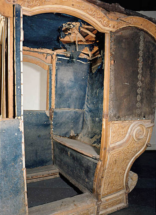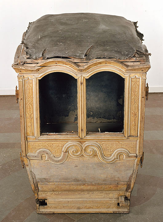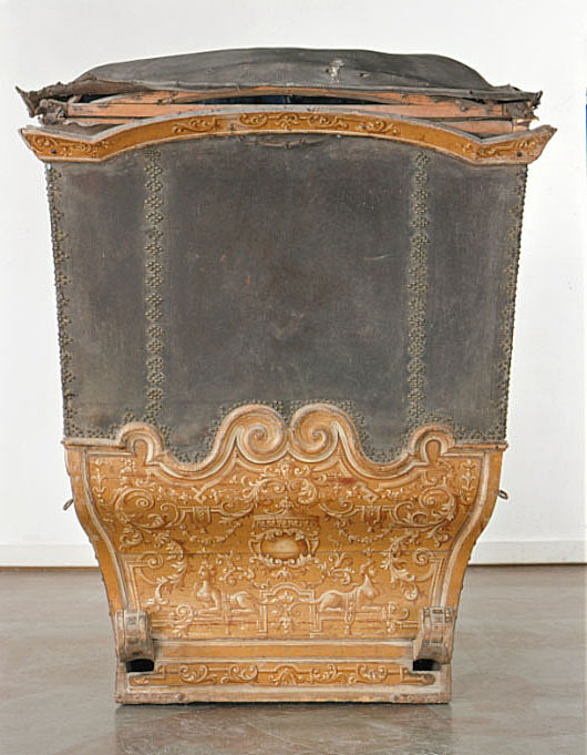 Vagnsdel av trä med snidade lister, plana sidofyllningar, utom i fram och bakväggen, som har horisontellt bukigt fyllningar. Korgen är till typ en kupé. Den har fönsteröppningar i de två dörrarna och i två smärre fönster i framväggen, men glasen är borta. Läderklätt tak och läderklädd övre korghälft på bakväggen och sidornas bakre partier. Lädret fäst med mässingstennlickor i mönster. Kornischen formar parvisa bågar över varje väggfält. Golv saknas men har sannolikt varit plant. Pannåmålningar i vitt och gul-bruna toner, rankmönstermer hermer o dyl. Invändig klädsel av blått kläde. Mitt i taket stjärnornament fäst med tennlickor.