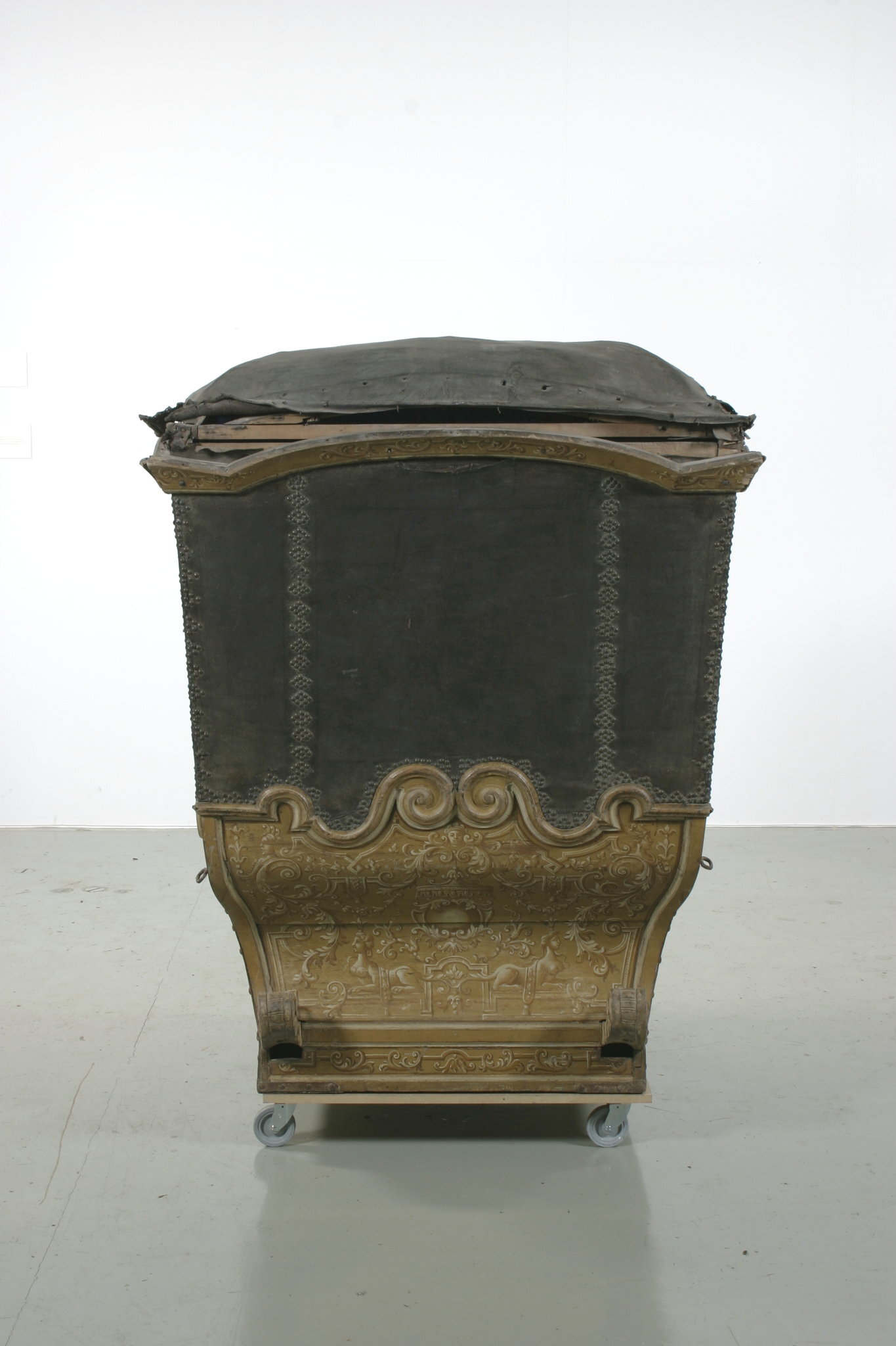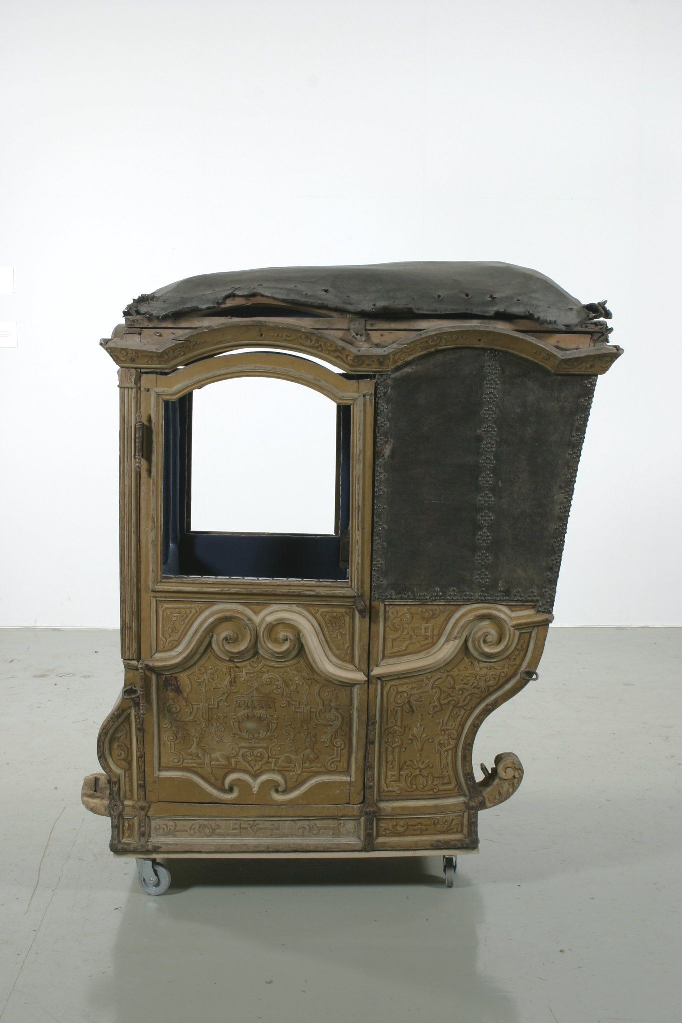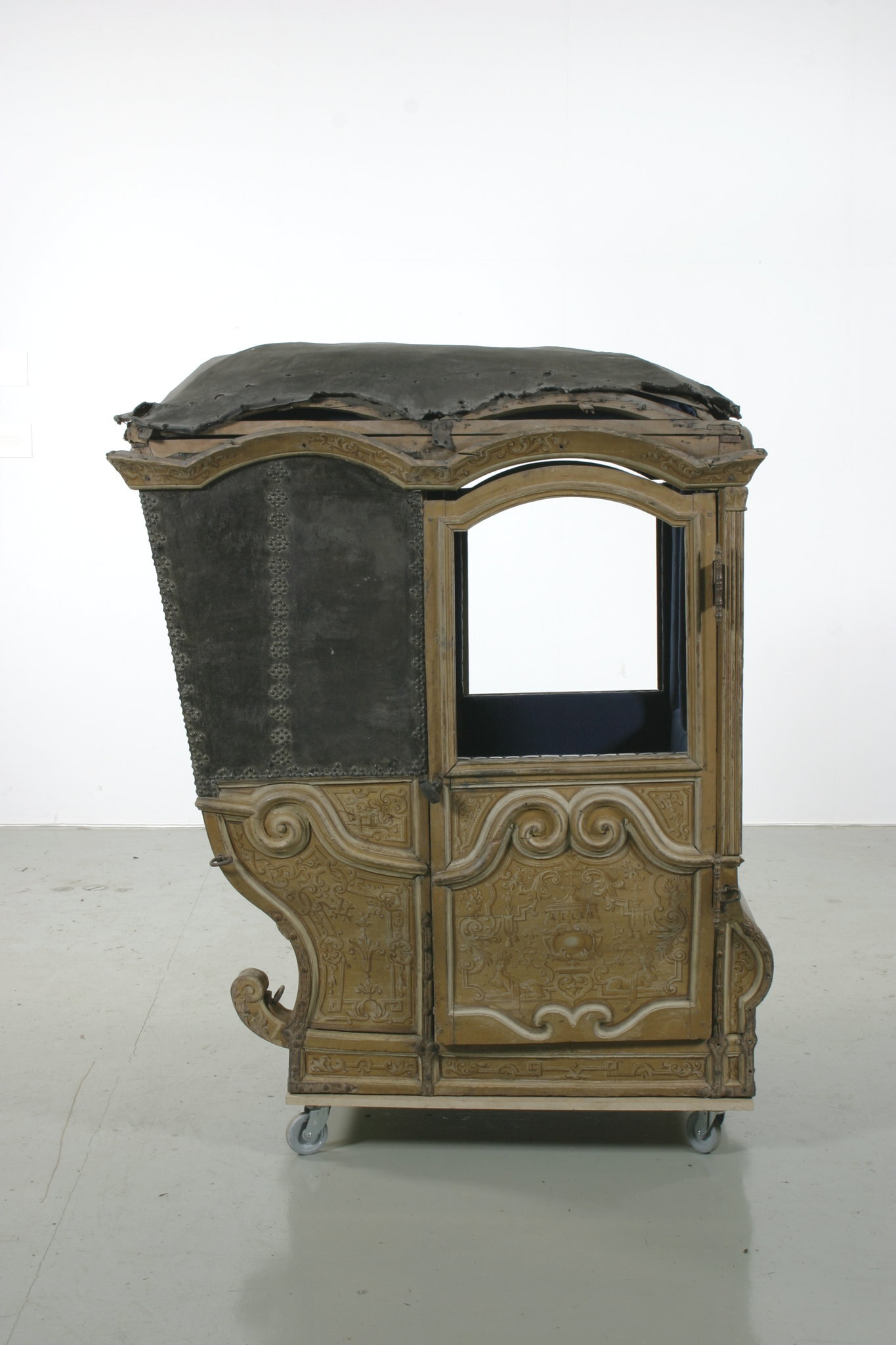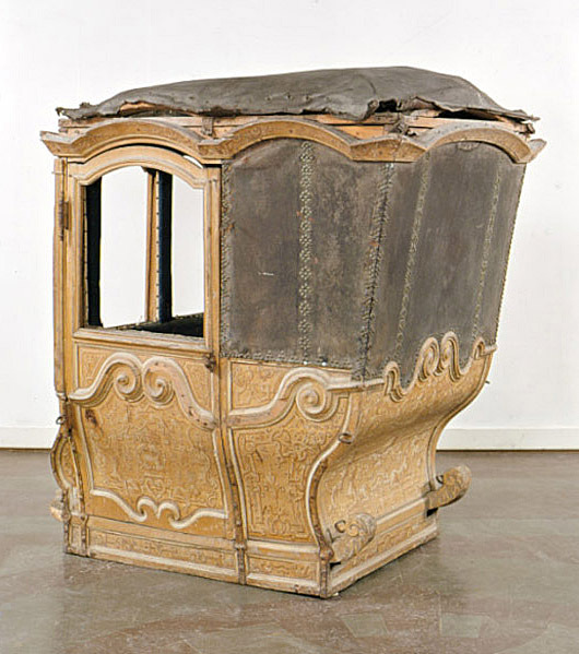 Vagnsdel av trä med snidade lister, plana sidofyllningar, utom i fram och bakväggen, som har horisontellt bukigt fyllningar. Korgen är till typ en kupé. Den har fönsteröppningar i de två dörrarna och i två smärre fönster i framväggen, men glasen är borta. Läderklätt tak och läderklädd övre korghälft på bakväggen och sidornas bakre partier. Lädret fäst med mässingstennlickor i mönster. Kornischen formar parvisa bågar över varje väggfält. Golv saknas men har sannolikt varit plant. Pannåmålningar i vitt och gul-bruna toner, rankmönstermer hermer o dyl. Invändig klädsel av blått kläde. Mitt i taket stjärnornament fäst med tennlickor.