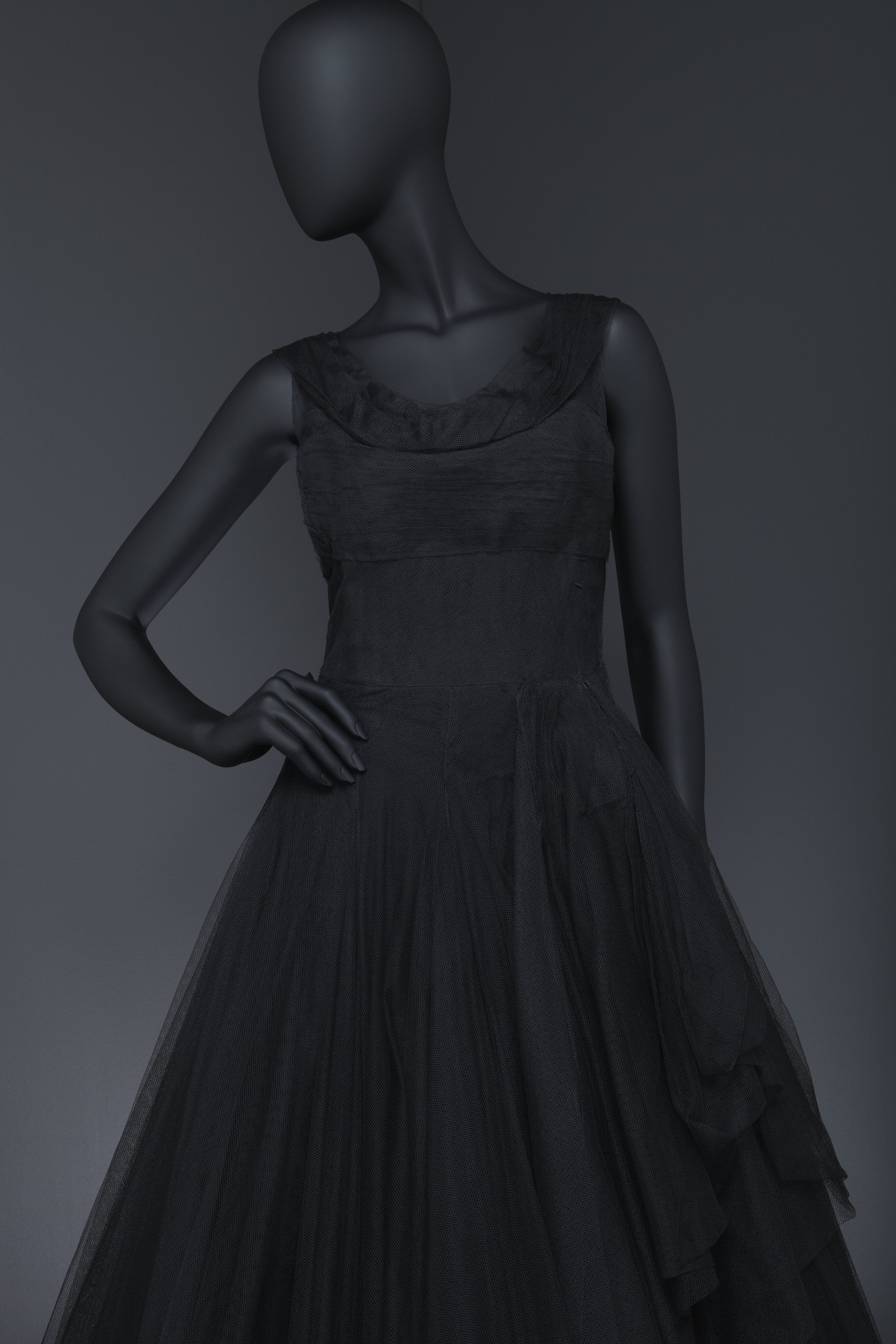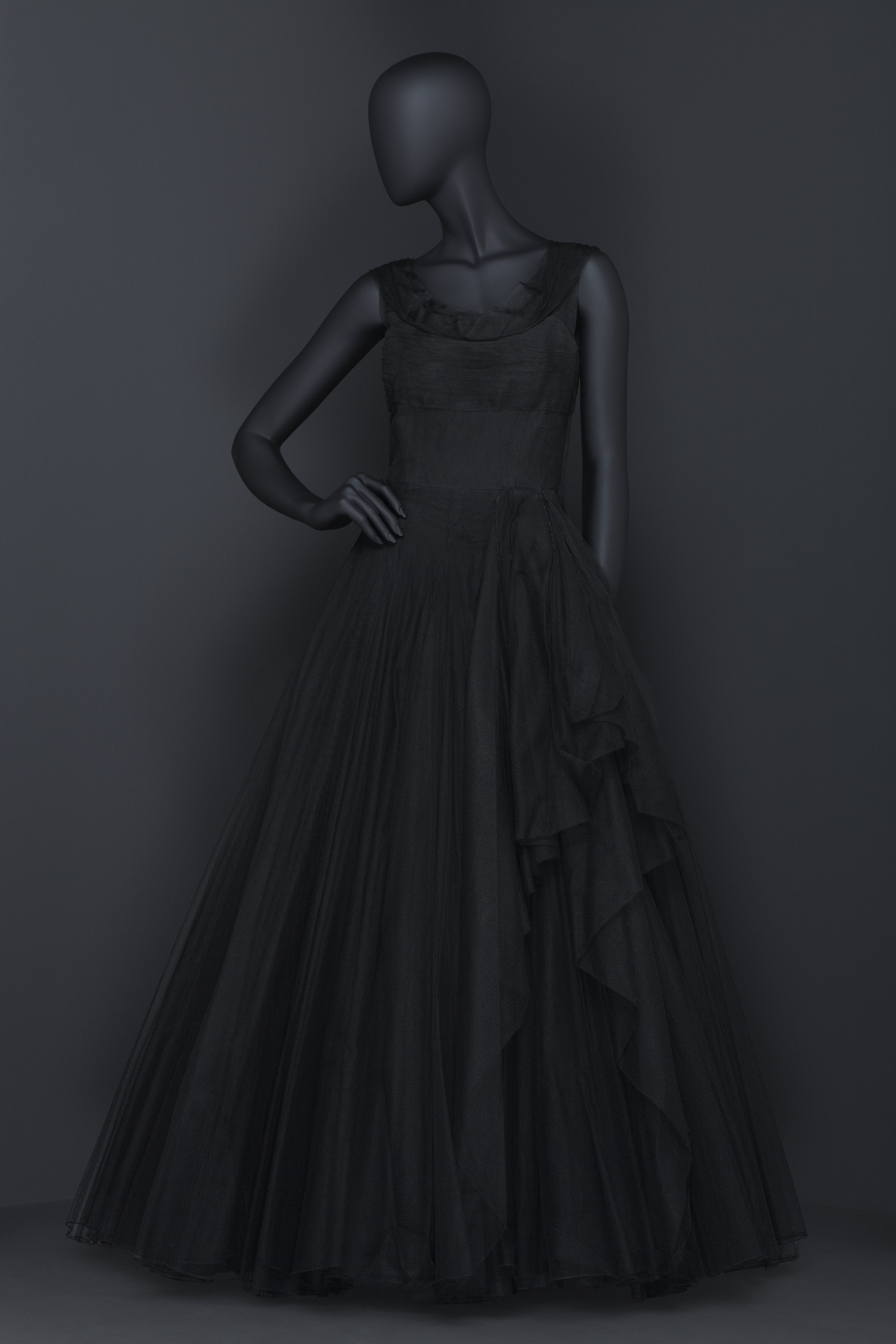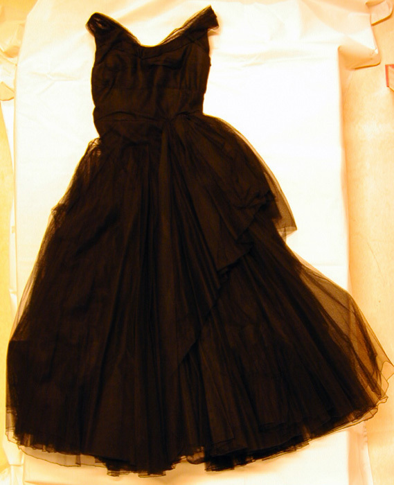Hellång, figursydd, ärmlös, svart klänning skuren med livsöm. Rundad ringning fram och V-formad bak. Axelband av veckad tyll. Vid veckad kjol i tre lager över en klänning av svart siden. På livet tyll i horisontella veck. Bystveck från livsömmen och upp. Blixtlås i vänstersida, längd 375 mm. Livet fodrat med svart siden och med isydda fjädrar samt ett påsytt brett tyg med isydda fjädrar. En i vardera sidan, två fram och två bak. I midjan ett 115 mm brett tygstycke fastsytt i ena sidan med nio fjädrar och fäst med 8 hakar och hyskor i vänster sida innanför blixtlåset. Ytterkjolen av tyll består av 10 våder, bredd upptill 70 mm och bredd nedtill 3330 mm.Mellankjolen av 6 våder, bredd upptill 180 mm, bredd nedtill 184 mm. Inre kjolen med 5 våder, bredd upptill 240 mm, bredd nedtill 1030 mm. Mitt bak ett motveck. I vardera sidan 2 enkelveck. Nedtill påsydd rynkad volang, bredd 320 mm och på mitten genomdragen med en tvinnad rynktråd av silke. Innerkjolen av svart taft i 7 våder, bredd upptill 180 mm och nedtill 1020 mm. Mitt på kjolen ett 230 mm brett fält, nedtill ett 240 mm brett fält av 5 rader påstickat stadband av konstfiberväv. Fållbredd 30 mm.