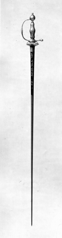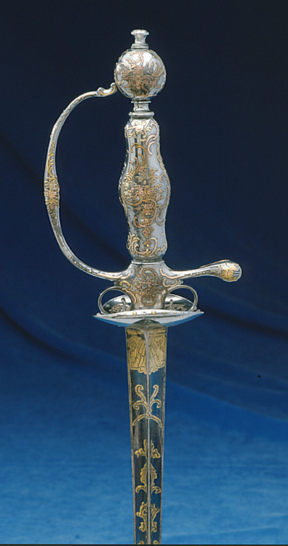Fäste i sin helhet av högglanspolerat stål med genomgående ornering av rokoko-ornament, blommor och smala bladrankor av påslaget guld i rosa, gult och ljusgrönt. Knapp närmast klotformig, nitknapp hög med insvängt mittparti, på översidan en påslagen blomma av guld. Handbygel smal med något vidgat mittparti. Bakre parerstång utåtböjd, droppformig ytterände. Fingerbyglar smala, inrullade. Parerplåtar njurformade, den yttre något större än den inre. Kavel spolformig. Klinga rak, tre-eggad s.k. stukatklinga. Starka delen blånerad med etsade och förgyllda ornament, på utsidan intill klingbasen ett nästan rektangulärt fält med trofégrupp av fanor. Därovanför från varandra skiljda rankornament, överst en fransk lilja. På insidan närmast basen ett rektangulärt fält med skrafferade snedbalkar, fältet avslutat med en fransk lilja. Därovanför två franska liljor, siffran XVI, tre franska liljor, spegelmonogram L i skrivstil (Ludvig XVI av Frankrike), tre franska liljor, en kungakrona av fransk typ samt tre franska liljor.