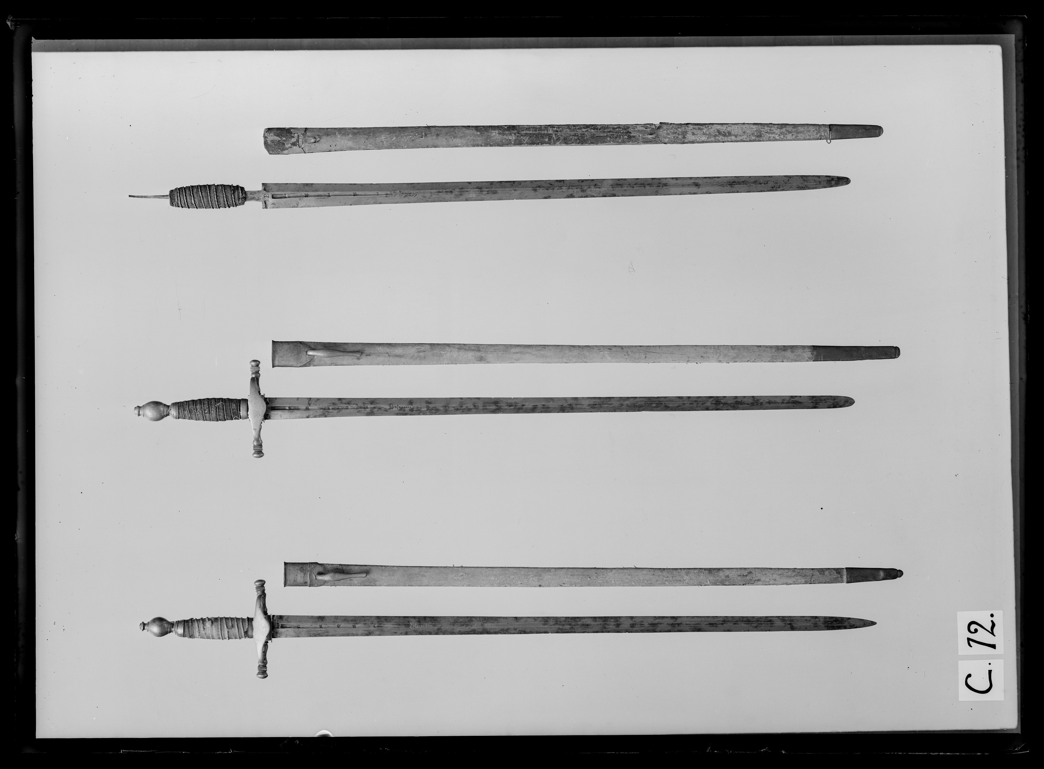 Fäste av slät mässing, korsformigt. Knapp nötformig med tämligen hög nitknapp på insvängd hals. Parerstänger korta, raka, balusterformiga med tvärställda knappformiga ytterändar. Kryss liggande rektangulärt. Plan yttre kryssbygel med vidgat mittparti. Bygelns ändar inböjda och fästa medelst lödning i parerstängernas mitt. Kavel spolformig med ovalt tvärsnitt klädd med rester av mörkblå sammet. Klinga rak, tvåeggad ursprungligen till karolinsk ryttar-värja av normaltyp, avkortad. Proberstämpeln P inslagen på basens utsida.