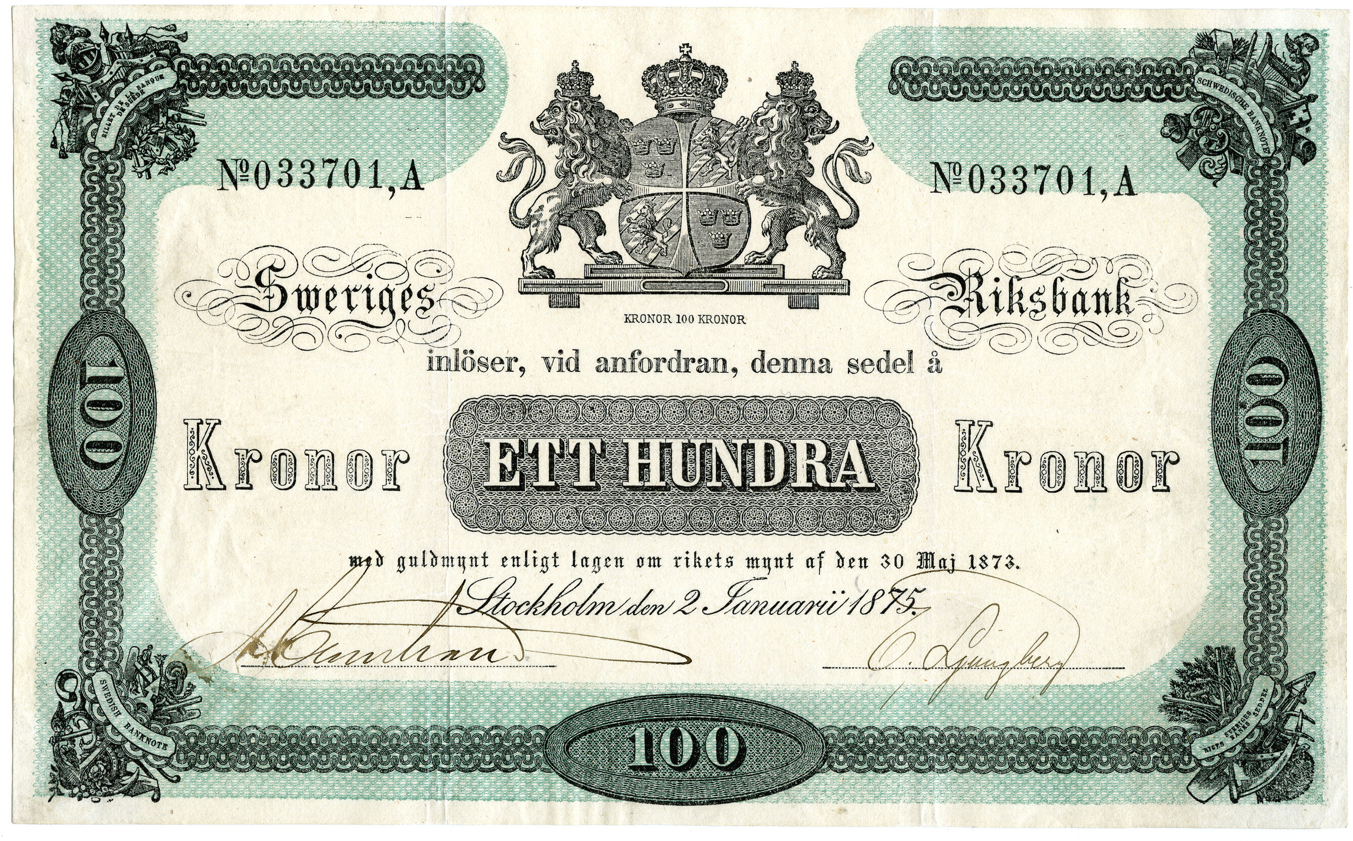 Upphov: Sveriges riksbank. Media: Statens historiska museer. Ekonomiska museet - Kungliga myntkabinettet/SHM, (PDM) Upphovsrätten till detta verk har gått ut och är därmed fritt att använda på alla sätt. Ange gärna upphovsperson om denne är känd.