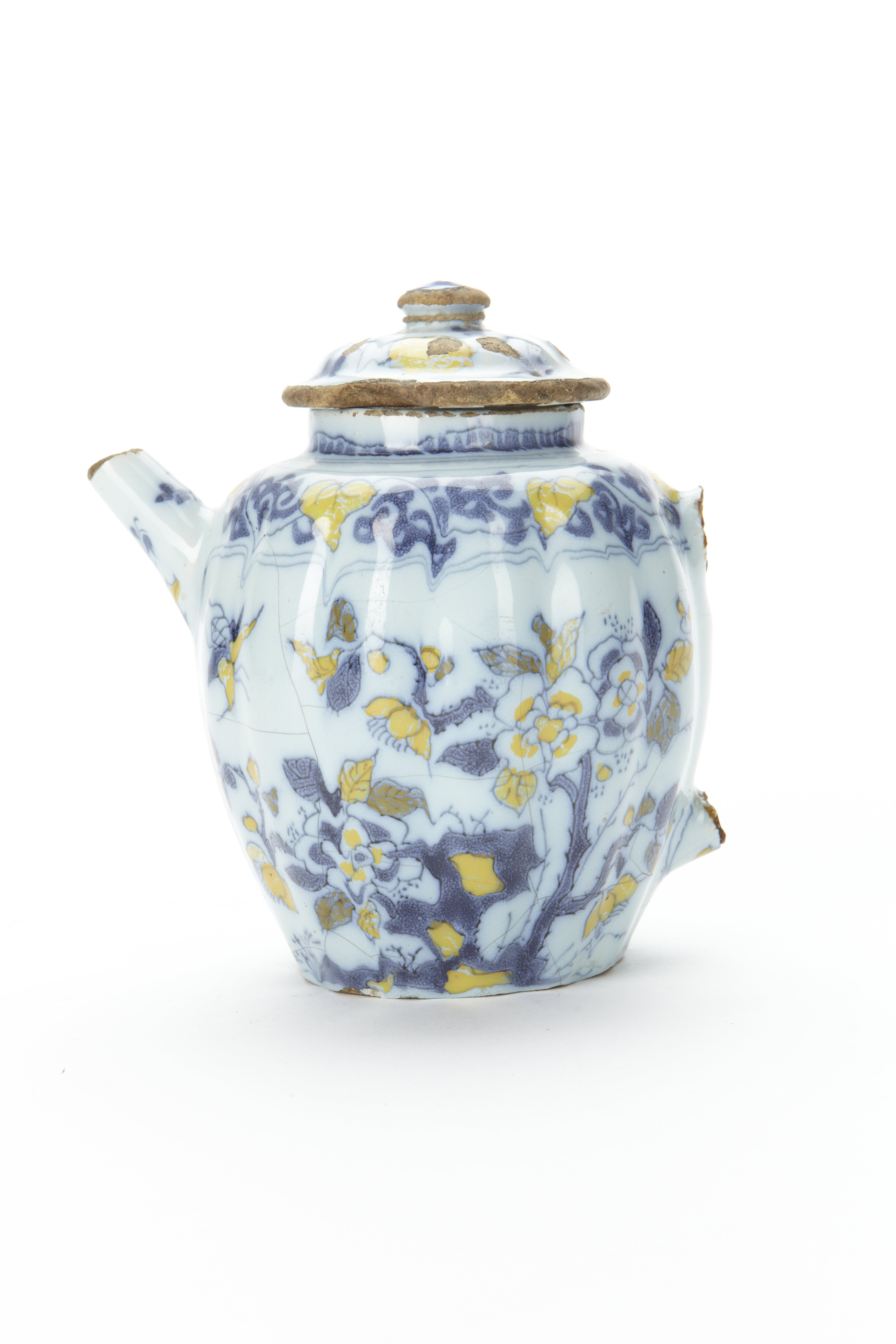 Tekanna av fajans med mörkblå och gul underglasyrmålning mot ljusblå grund.
