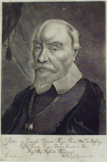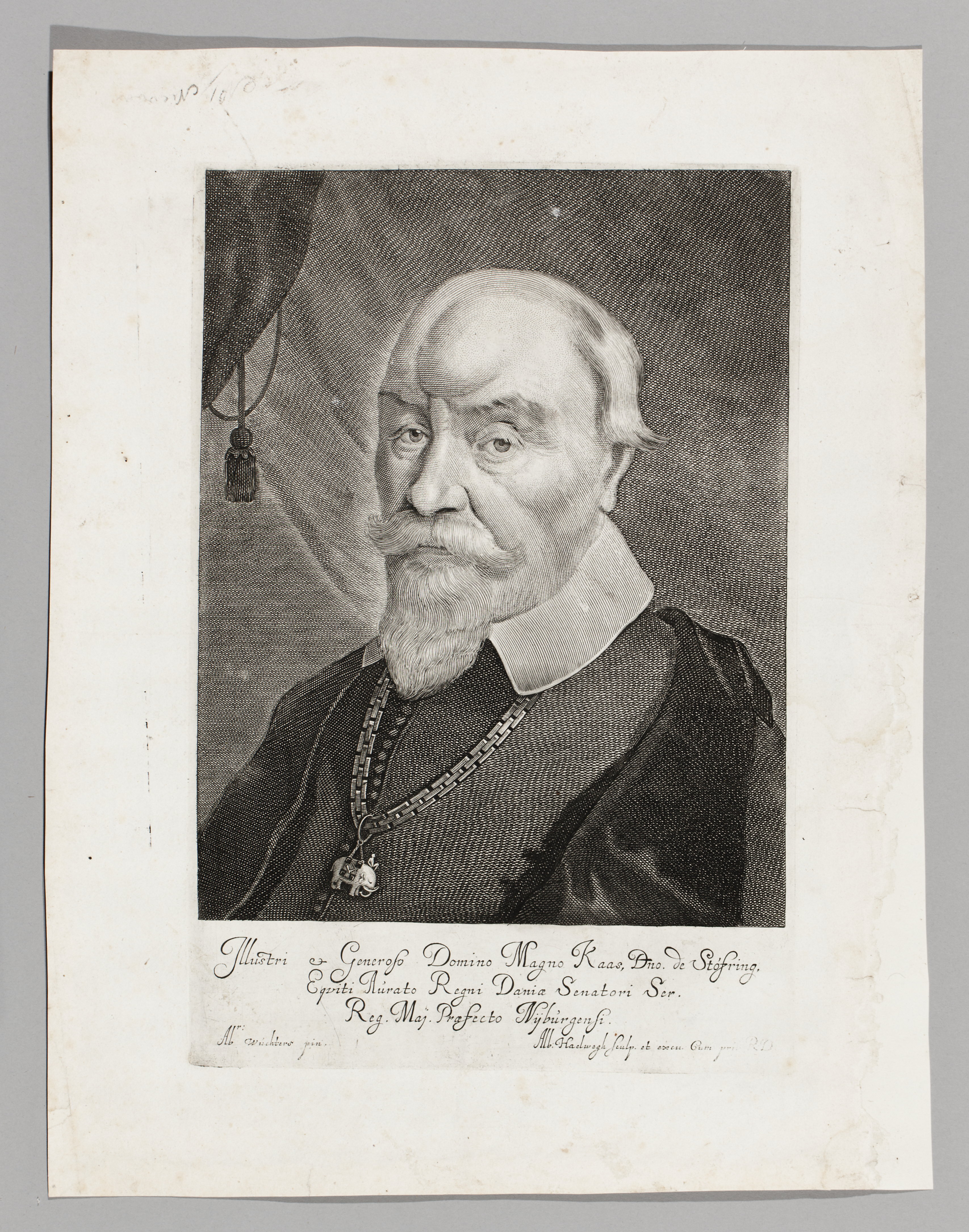 Sign. "Abr: Wuchters pin. Alb: Haelwegh sculp excu cum priv R.D.". Bröstbild. Klädd i riksrådsdräkt. Elefantorden. Under porträttet text: "Illustri et Generoso Domino Magno Kaas, Dno de Stofring…".