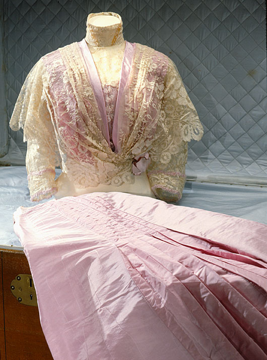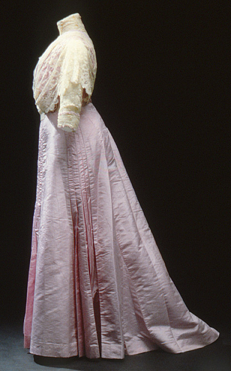 Kjol till förmiddagsklänning, buren av prinsessan Ingeborg (1878-1958). Klänningen ingick i hennes resegarderob när hon övervarade prins Wilhelms bröllop med Maria Pavlovna i St. Petersburg i Ryssland 1908. Från Augusta Lundin, Stockholm 1908. Kjol av syrén-färgat sidentyg i två olika nyanser och kvalitéter. Det ena en taft och det andra en rips med moaré-effekt. Modellen är utställd med mycket vidd nedtill som släpar något bakåt. Kjolen har tre infällda lodräta veckpartier: ett bredare mitt fram och två smalare på sidan. Midjan är markerad med ett 140 mm brett veckat band av laxrosa siden. Knäppning i ryggen med 5 hyskor och hakar. På var sida om knäppningen en separat hake samt i sidan en vit hälla. Under knäppningen ett 300 mm långt sprund med 6 hyskor och hakar. Fållad kant nedtill.