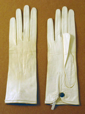 Smal vit glacéhandske med tre sömmar på handryggen. 70 mm långt sprund på baksidan som knäpps med mässingsknapp (?), 10 mm i diam, med blomsterdekoration. Tryck i blått på insidan: "7".