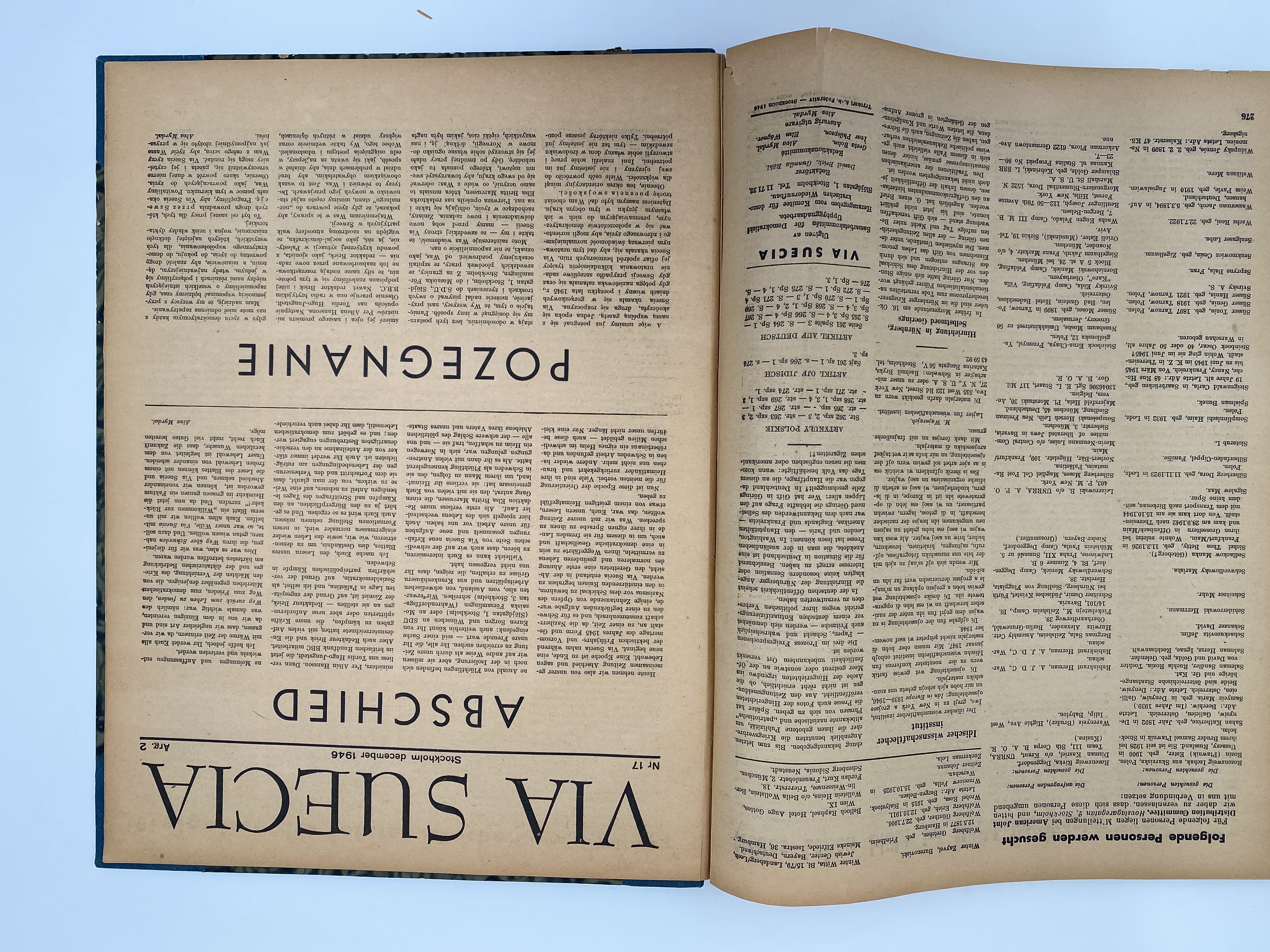 Inbunden volym med utgåvor av tidskriften Via Suecia 1945-46. Publikationen gavs ut av Samarbetskommittén för demokratiskt uppbyggnadsarbete under ledning av Alva Myrdal. Artiklarna trycktes på flera olika språk och riktade sig till de i Sverige överlevande från Förintelsen, som genom tidningen kunde lära sig om landet där de befann sig samt eftersöka närstående.