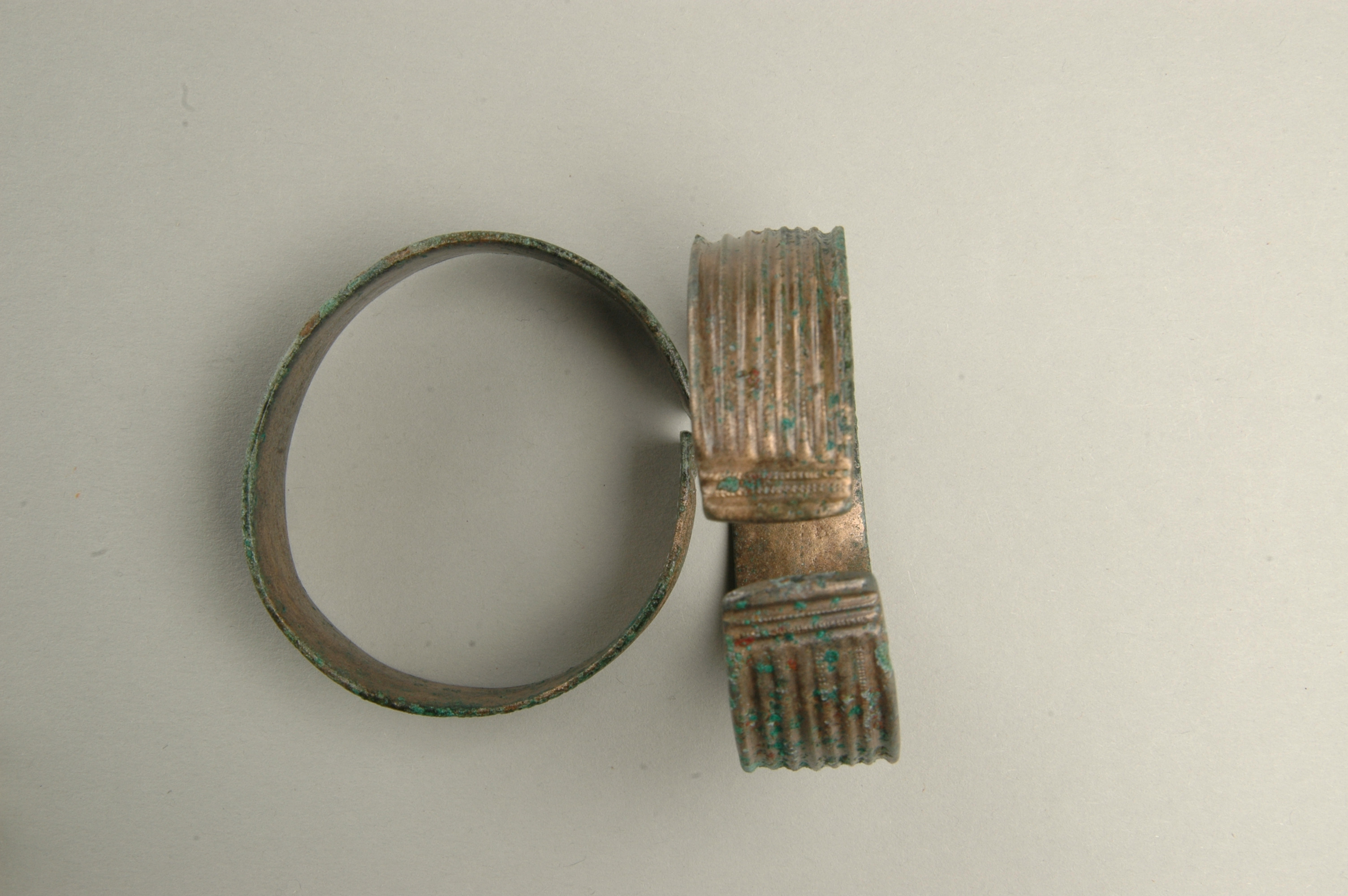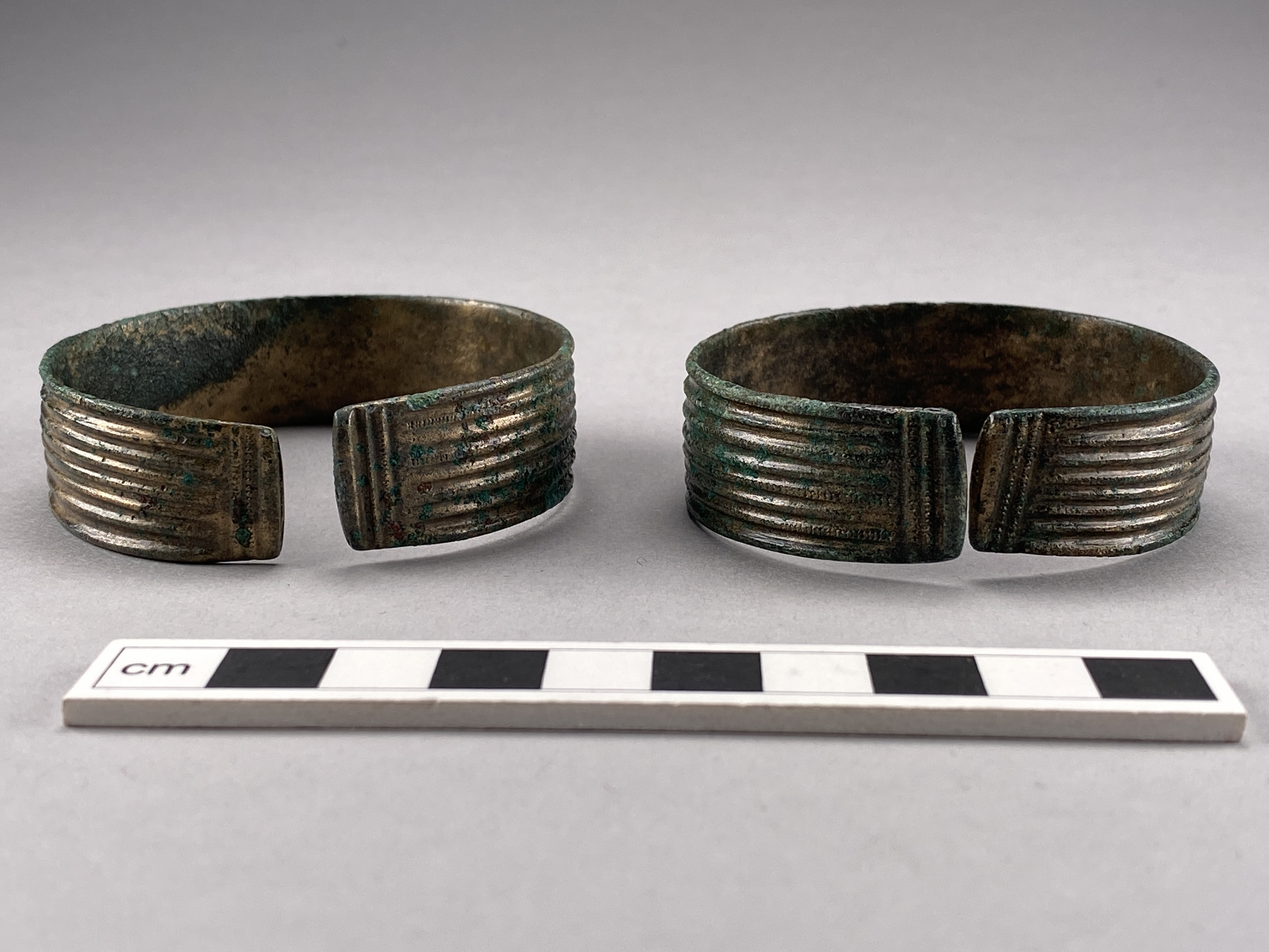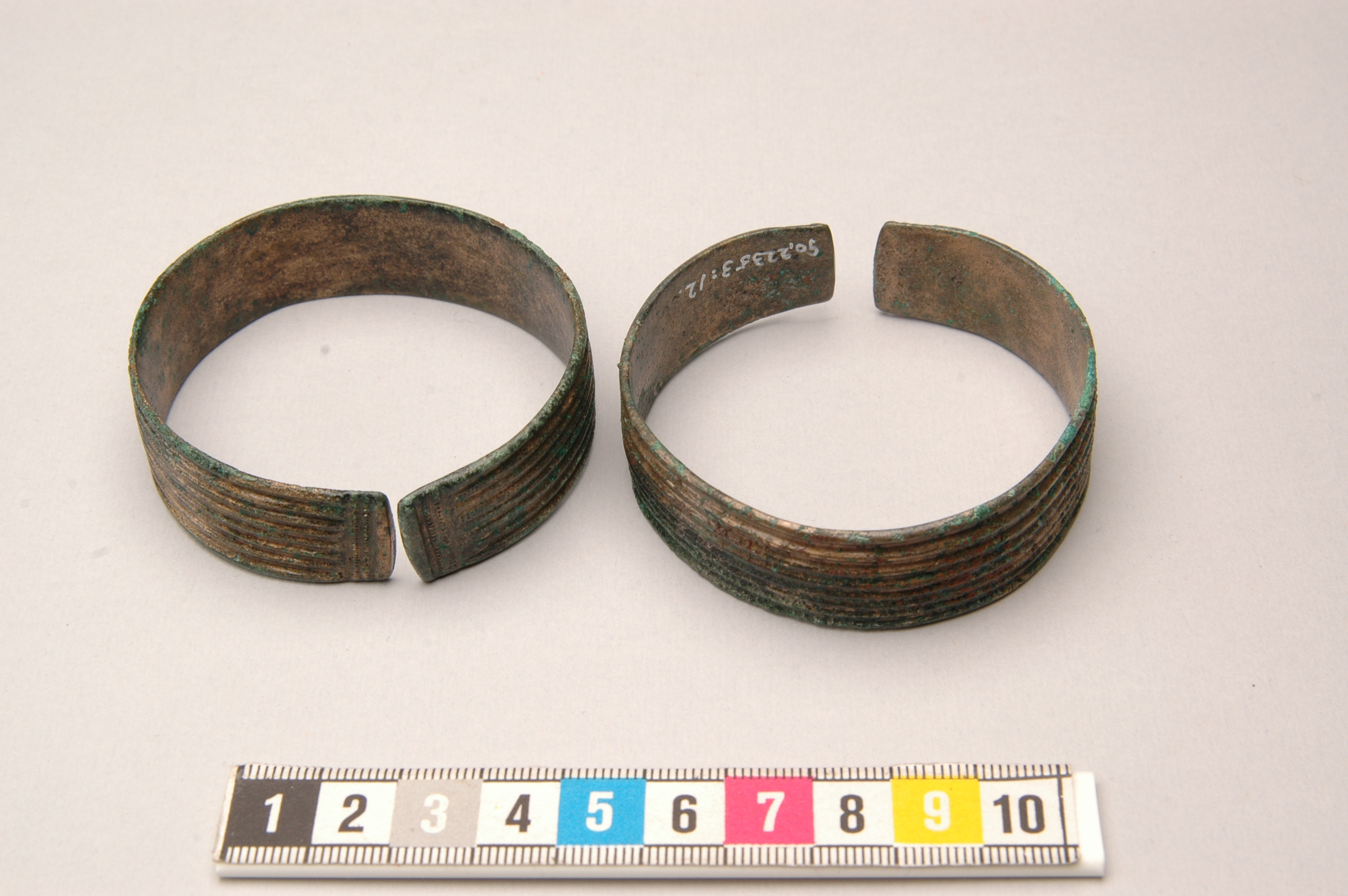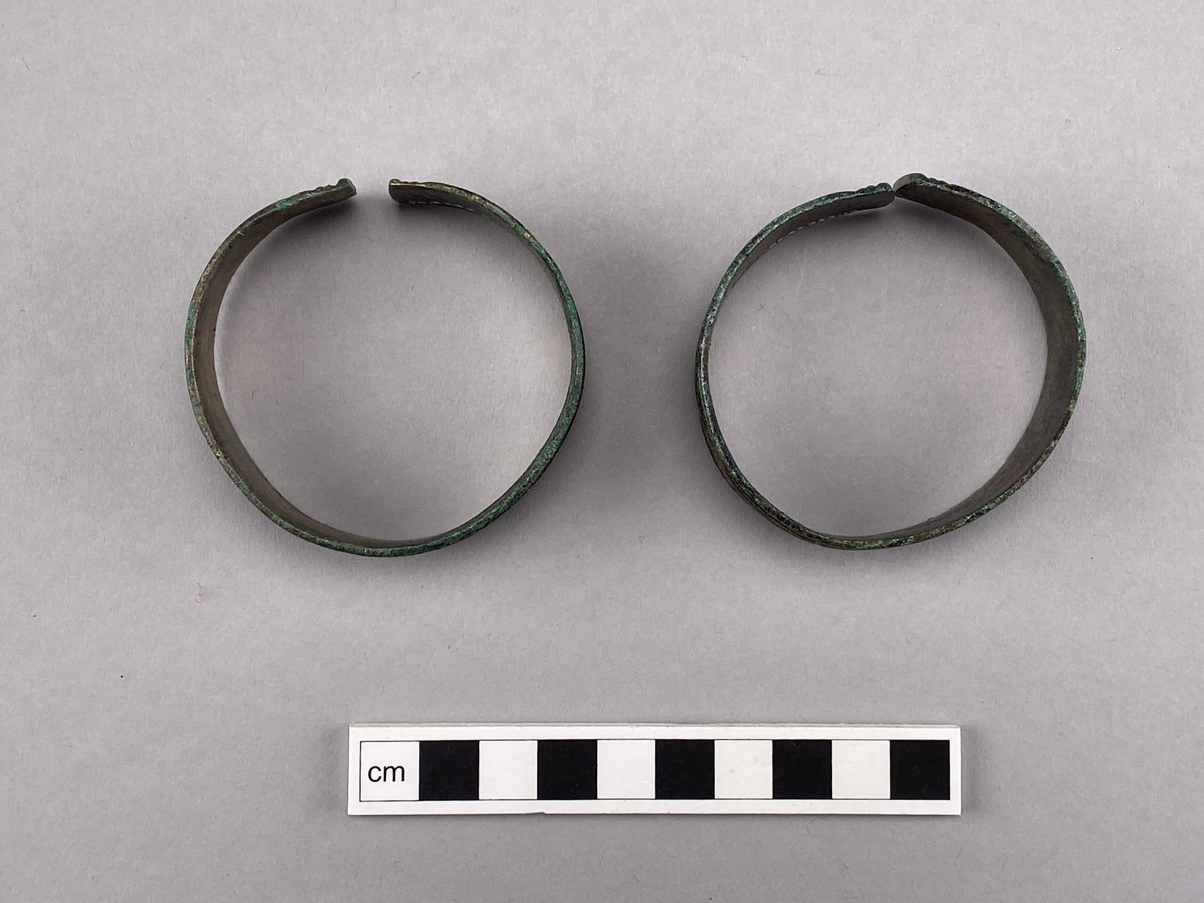 Två armringar av brons. Breda, flata och på utsidorna försedda med en likartad ornering av kraftiga längsgående åsar, delvis försedda med en inpunsad tvärstriering.