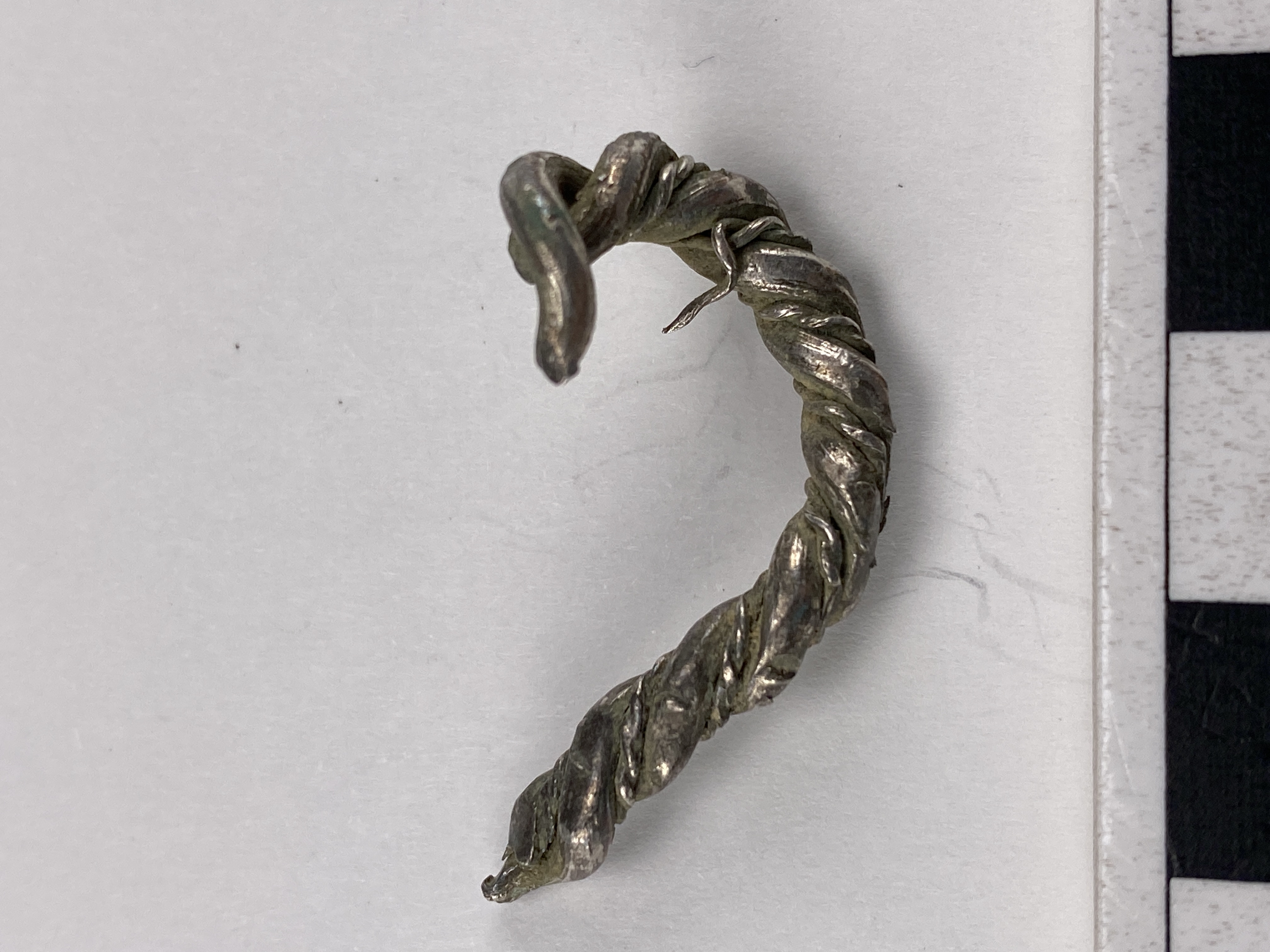 Flätad av 2 tjocka tenar och 2 dekorativa mindre silvertrådar vilka består av två tvinnade silvertrådar.