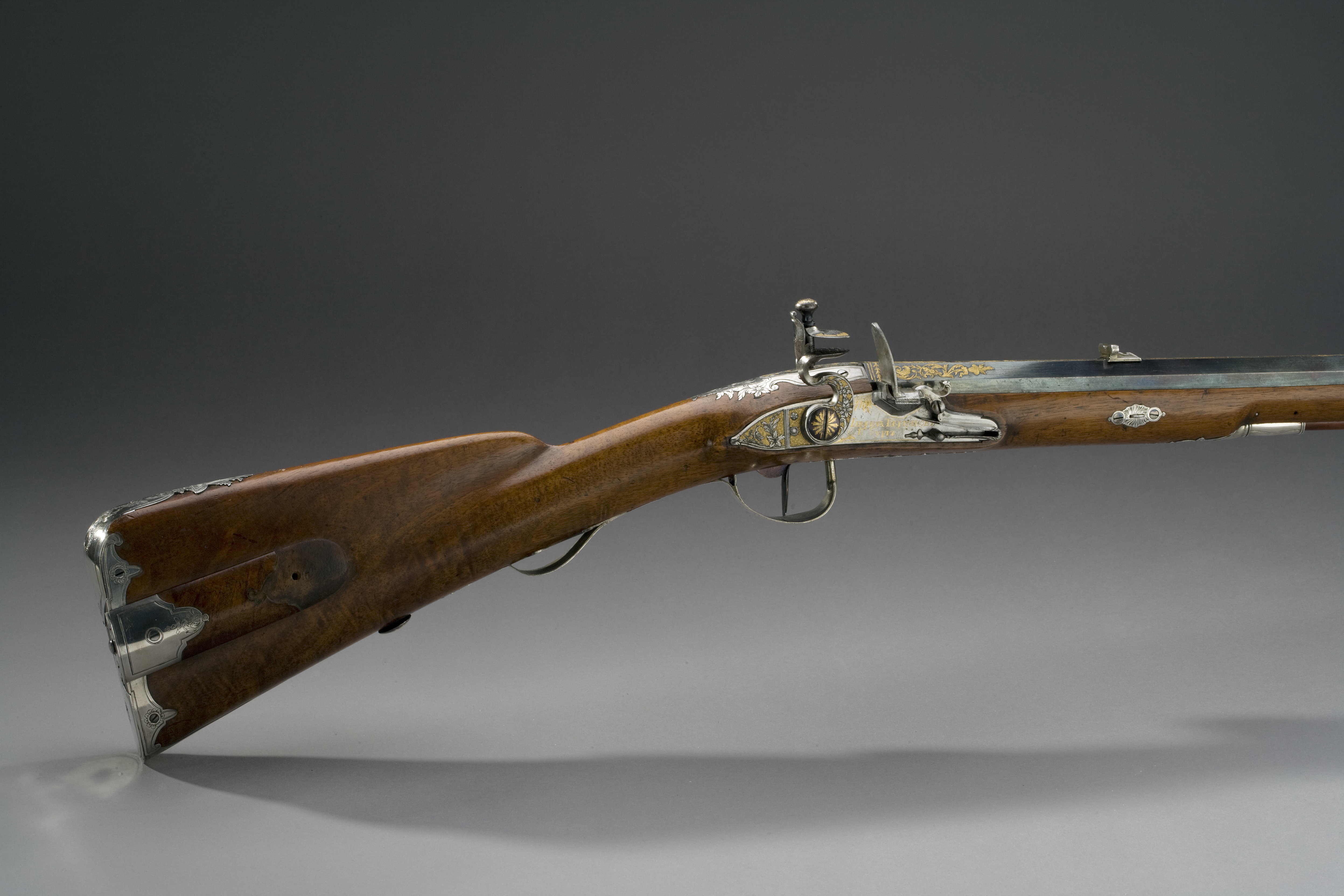 Åttsidig, blånerad pipa av stål, åtta räfflor. Runt mynningen koncentriska cirklar. På kammaren inslagen gulddekor, rokoko-ornament och trofégrupper, därframför fält med inslagen guldsignatur, kyrilliska bokstäver: "GAVRILA PERMJAKOV S.P.BURG", runt kornet guldstrålar, vid mynningen tre guldlinjer. Svansskruven ej blånerad, på svansskruvbladet graverad rankdekor mot punsad och förgylld bakgrund. Guldfordat fänghål. Riktmedel: Inlaxade riktmedel av silver, ståndsikte med graverad bladdekor på plattan. Triangulärt, smalt korn. Fästning: Pipan fäst med blånerad krysskruv med gulddekor på huvudet samt två engelska pipstift och däremellan främre rembygelns skruv. Flintlås med plant låsbleck, något fasade kanter, försänkt bakspets. Snidad dekor i relief mot punsad och förgylld bakgrund, på bakspetsen en ranka och en fågel, därframför och till hanen ett punsat och förgyllt fält. Framför hanen dekor av inslaget och prickat guld, upptill en strålande sol, därnedanför signatur som på pipan: "GAVRILA PERMJAKOV S.P.BURG". S-formigt svängd, platt hane med något fasade kanter, graverad blomranka mot punsad och förgylld bakgrund, runda käkar, på överkäken delvis förgylld dekor. Blånerad, omvänt päronformig käkskruv, dekor av inslaget guld. Nötskruv med blånerat huvud, inslagna guldstrålar. Kantig fängpanna med fals. Batteri med enkel graverad och slipad dekor på ryggen, batterifjädern nertill avslutad med långt, balusterformigt fjäderlöv. Nöt, nötstudel, avtryckarstång samt slagfjäderns, nötstudelns och stångfjäderns fästskruvar blånerade. Fästning: Två blånerade låsskruvar med soldekor i guld. Rak, blånerad avtryckare och blånerat avtryckarbleck. Helstock av valnöt med kindstöd och kolvlåda. Näsband av horn, övriga beslag av silver med graverad rokoko-dekor, blånerade fästskruvar. Tvådelad bakplåt med tunga på kolvryggen, urneformig avslutning med bladknippe, på kortsidorna en respektive två silverplåtar. På kolvlådelockets båda ändar silverplåtar (det främre beslaget saknas), blånerad fjäder. På kolvens undersida en plåt med bladformig avslutning. Vid kindstödets båda ändar bladrankor, nedanför kindstödet ett beslag med ett rör, l: 31 mm. Tvådelat sidbleck i form av rokokokartuscher. Runt svansskruvbladet bleck med blomdekor baktill. Två rörkor, spetsrörkans spets med rokokodekor. Varbygel med kort främre arm, avslutad med bladknippe. Lång, delvis dubbel bakre arm, avslutad med bladknippe. På bygeln ett graverat fält med en trofégrupp. Fästning: två skruvar på bakre armen, stift igenom stocken vid framstolpen. Bakom varbygeln en fästknapp för bärrem av blånerat stål med inslagen gulddekor. Blånerad rembygel på framstocken. Tillbehör: Laddstock av trä, l: 568 mm, framtill skodd med horn, l: 30 mm, svarvad stötplatta, d: 16,4 mm.