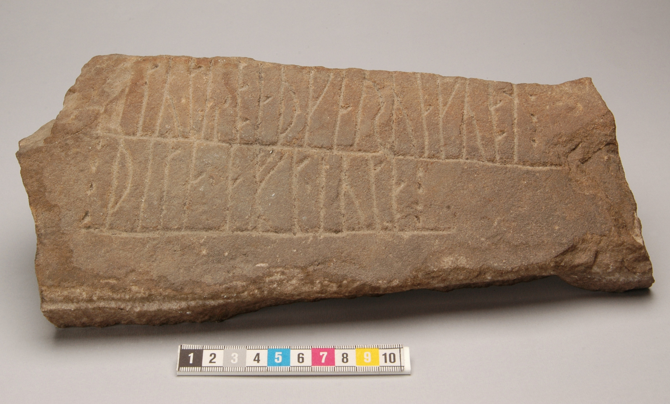 Runstensfragment i sandsten avhugget från runsten på order av Seton 1826. U 4 i RAÄ:s sammanställning. Runraden uttyds som "tutiR baþ kaura kubl:þita aft iuta"