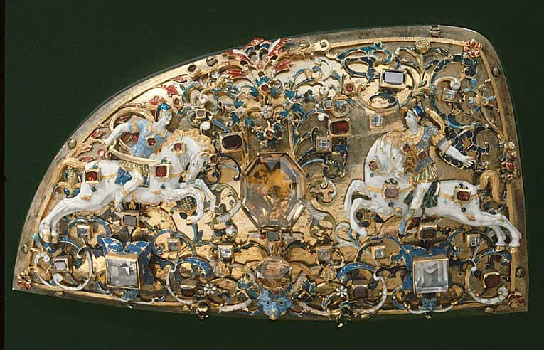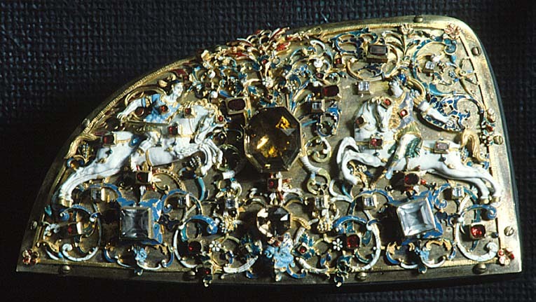 Sadelbeslag, frambomsplåt, tillverkad av guldsmeden Ruprecht Miller, Stockholm ca 1618. Beställda av Karl IX, men inlämnade till skattkammaren först 1631 av Millers änka.