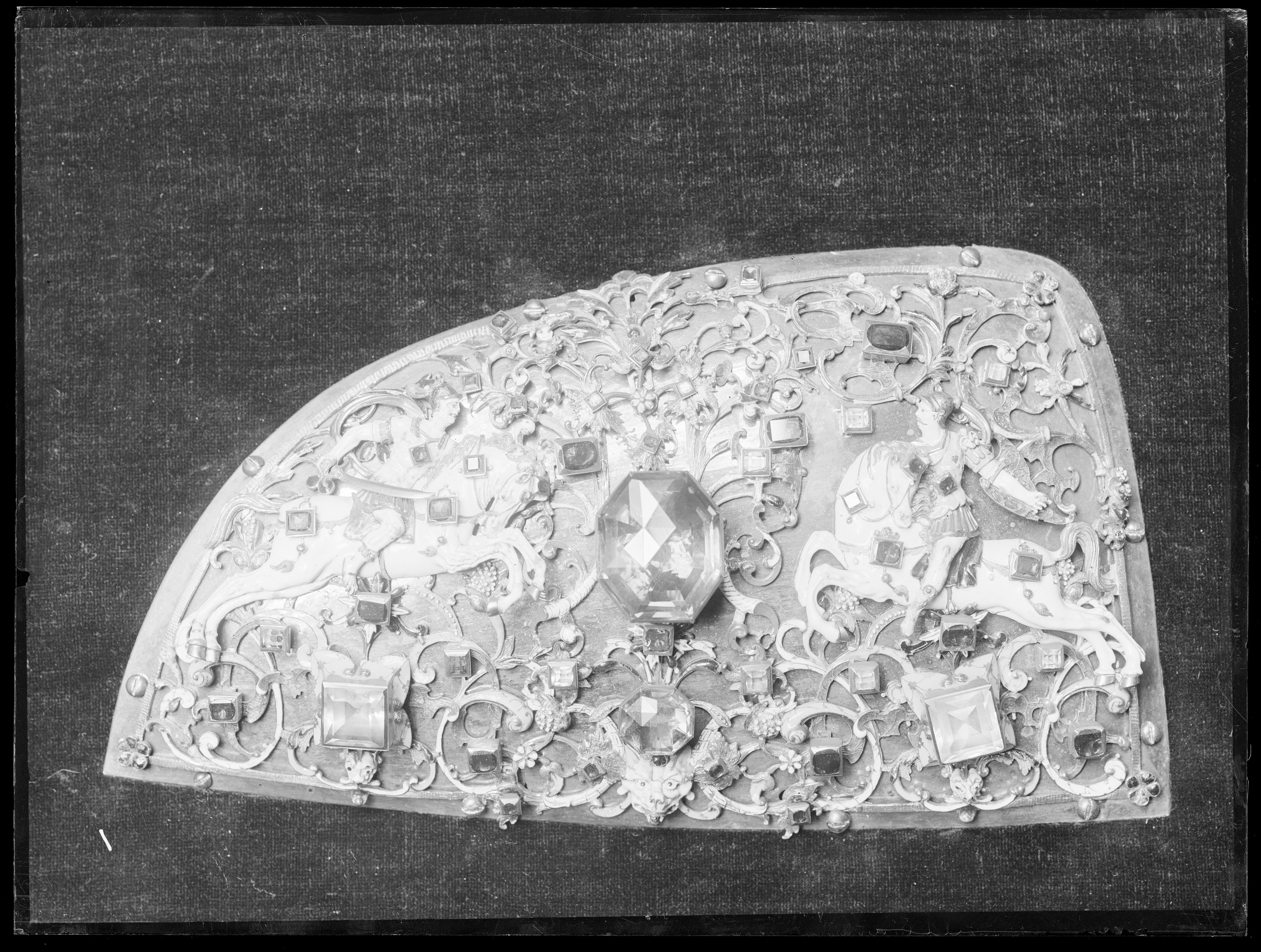 Hälften af en framsadelboms plåt af förgyldt silfwer med rikt arbete af emaljeradt Guld och fattade 1 större röktopas, 2 större hwita stenar, 11 smärre dito dito och 32 röda do 91) samt prydda med 2 emaljerade hästar med ryttare